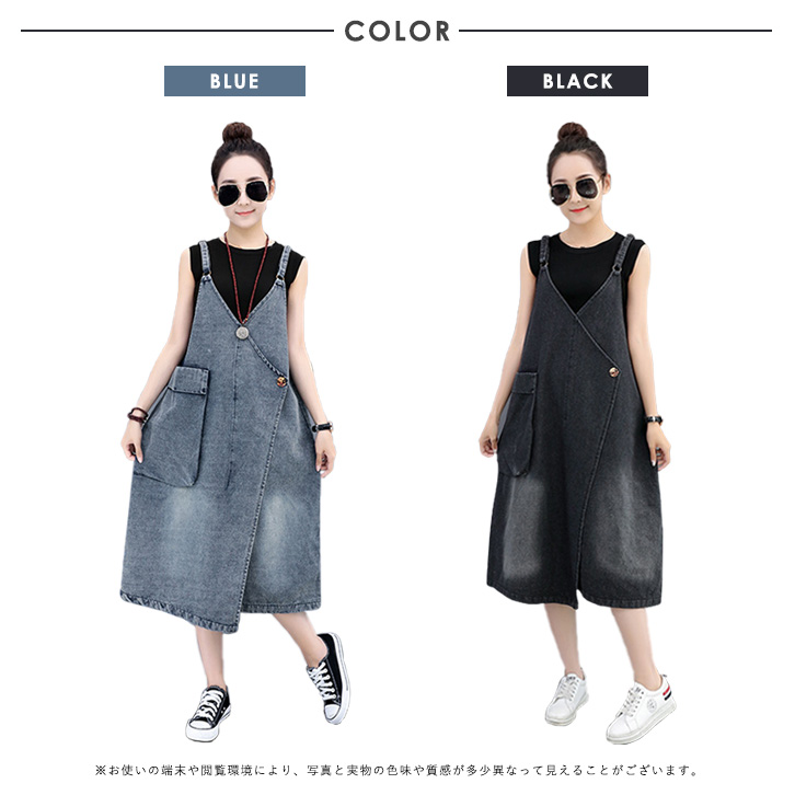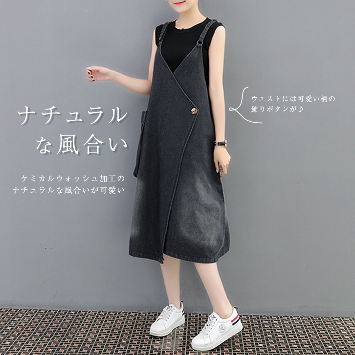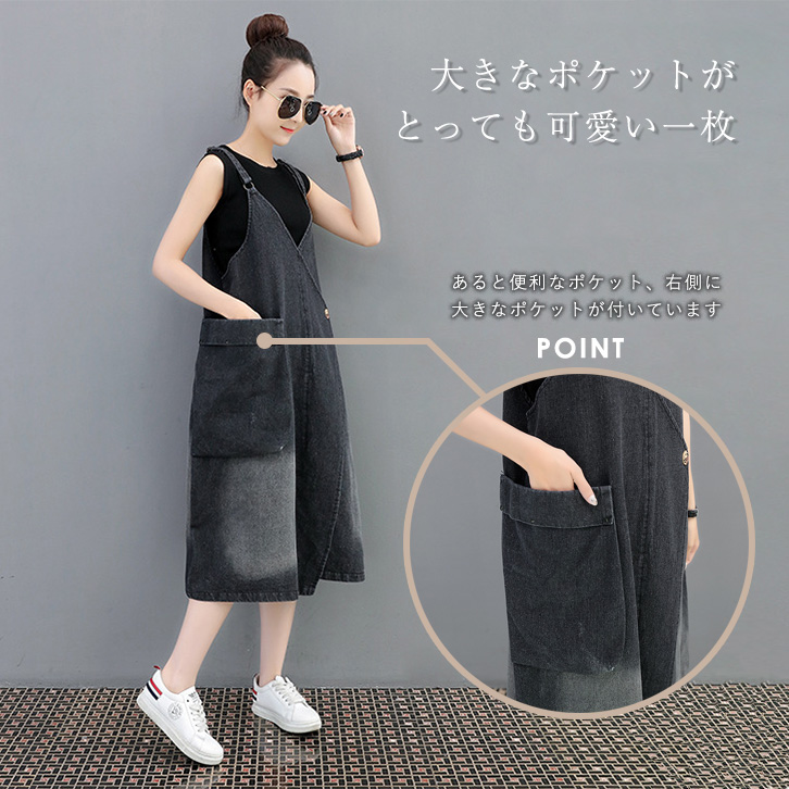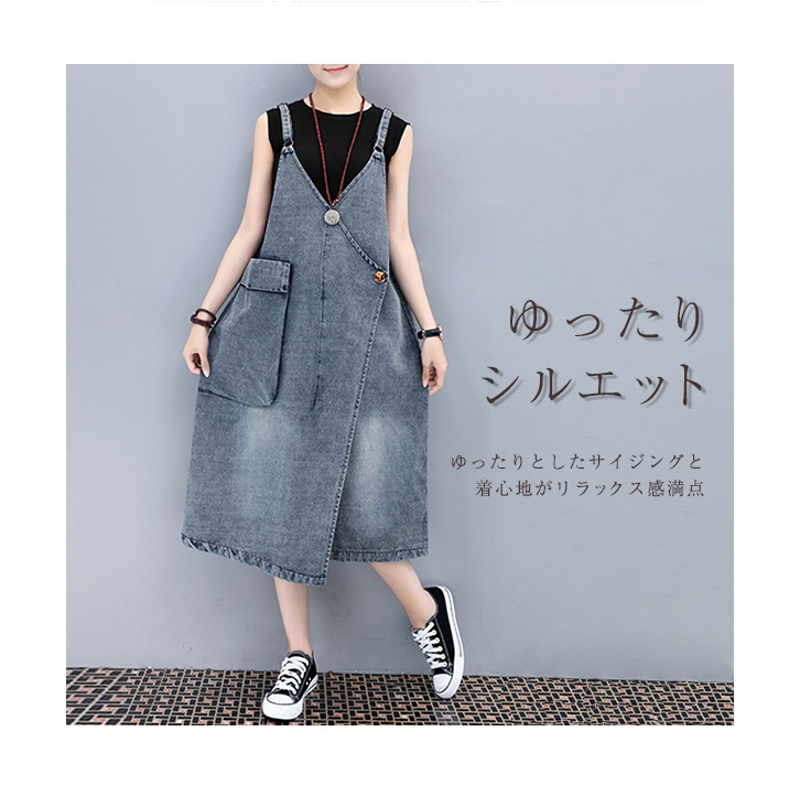 デニムワンピース ゆったり ゆったりシルエット カジュアル ケミカルウォッシュ加工 ナチュラル 飾りボタン かわいい デニムサロペット オーバーオール デニムスカート ジャンパースカート ミモレ丈 ポケット付き 肩ひも調節可能