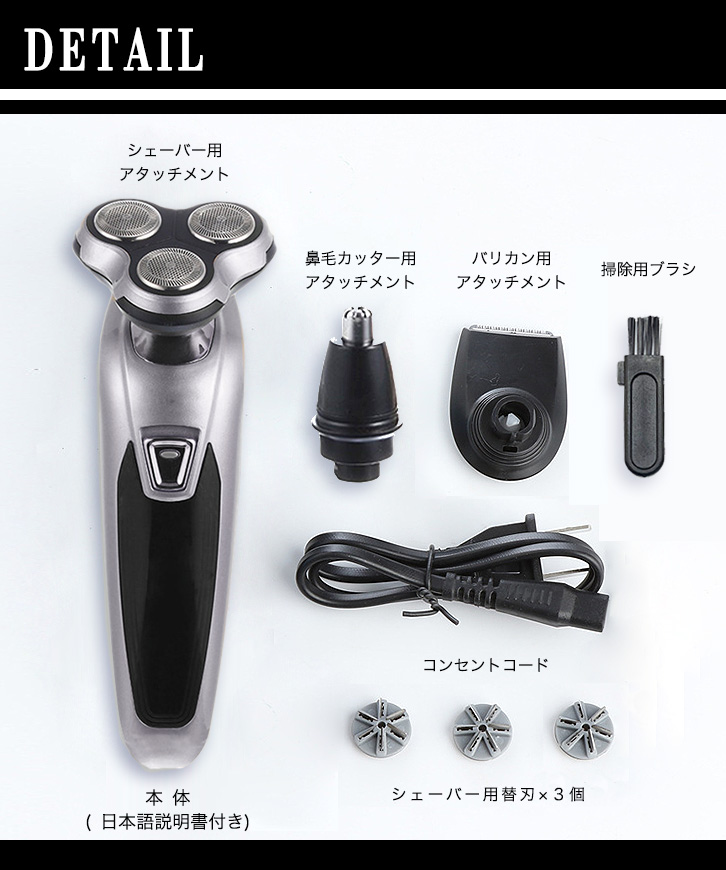 【セット内容】本体、ひげそり用・鼻毛カッター用・