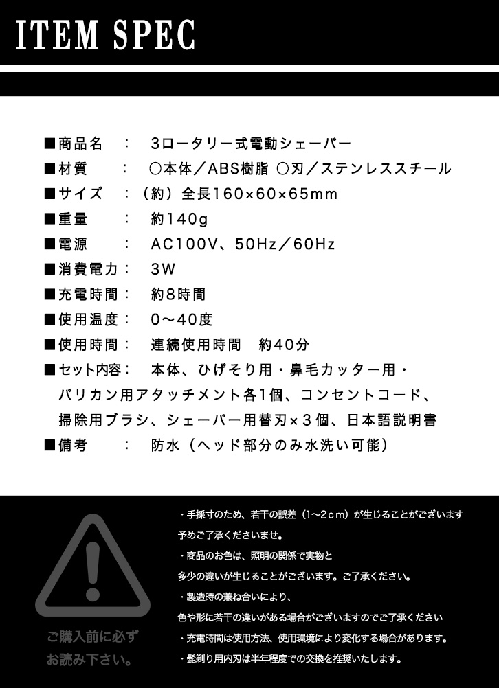 掃除用ブラシ、シェーバー用替刃×3、日本語説明書