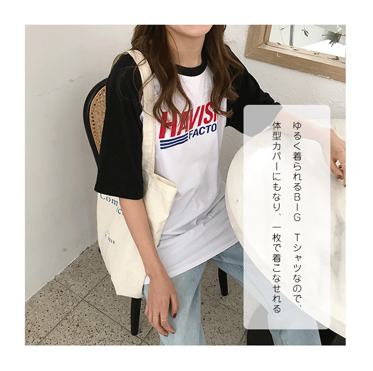 Tシャツ シンプル ビッグTシャツ ゆるっと 体型カバー カジュアル ロゴ入り ゆったりUネック 抜け感 着心地抜群 半袖 ハーフ丈 5分丈 5分袖 二の腕カバー 細見え効果 カジュアルコーデ 合わせやすい ホワイト