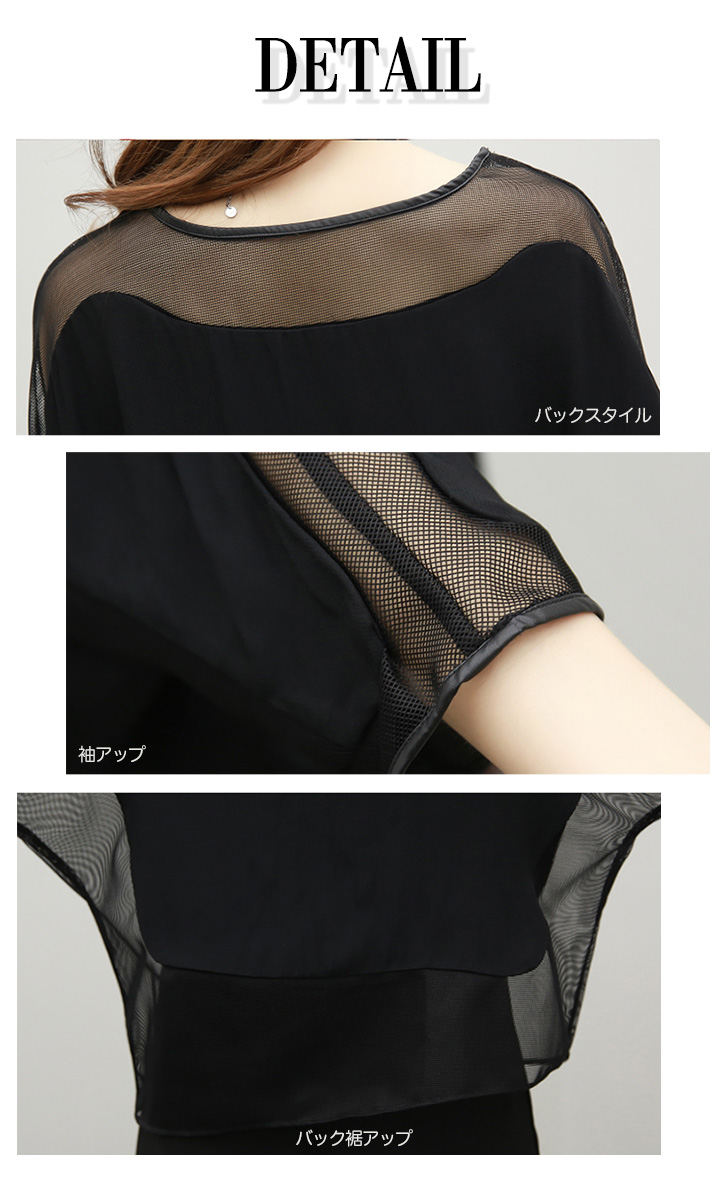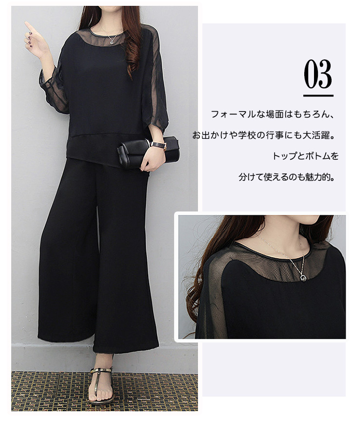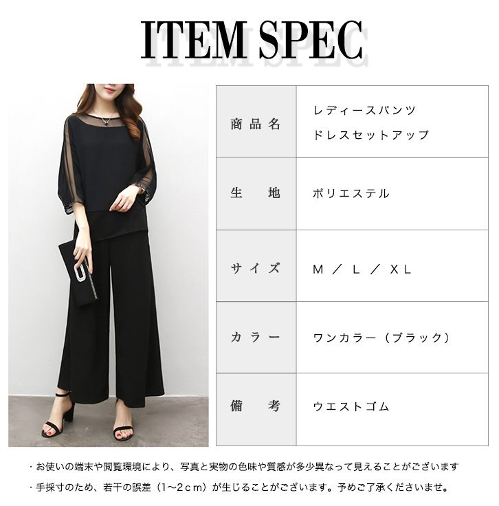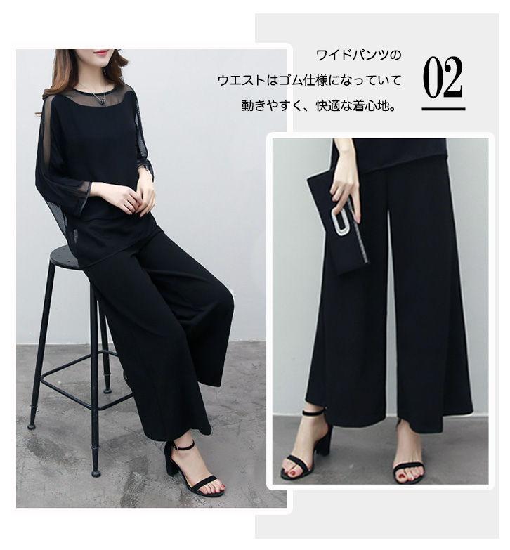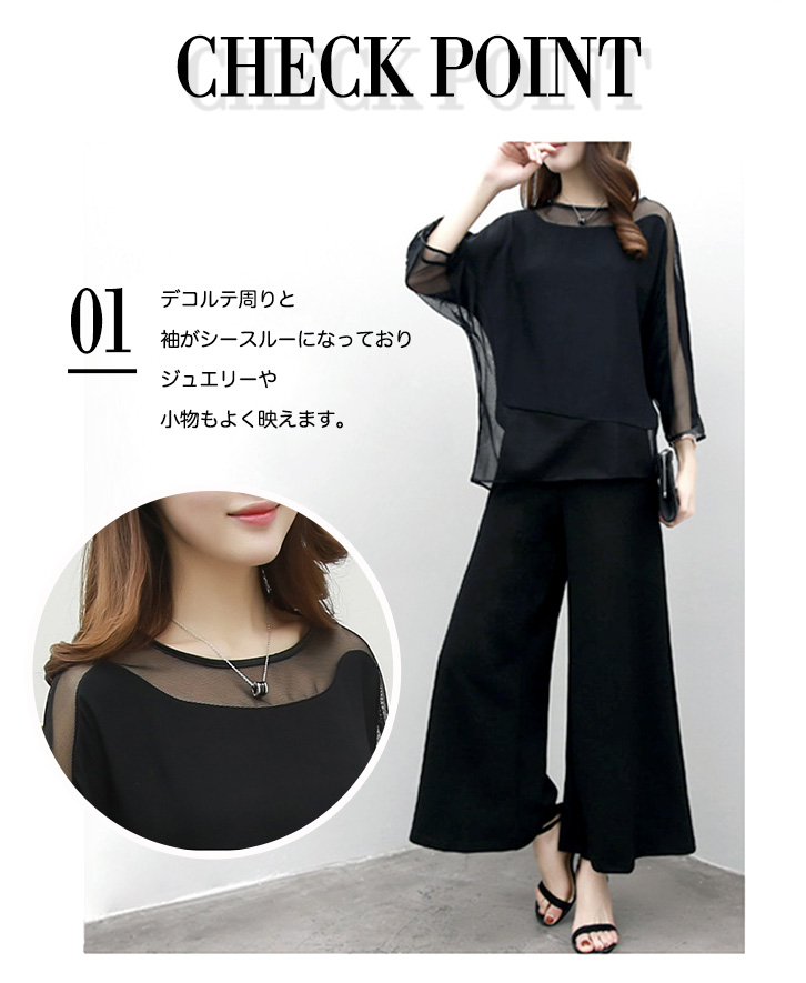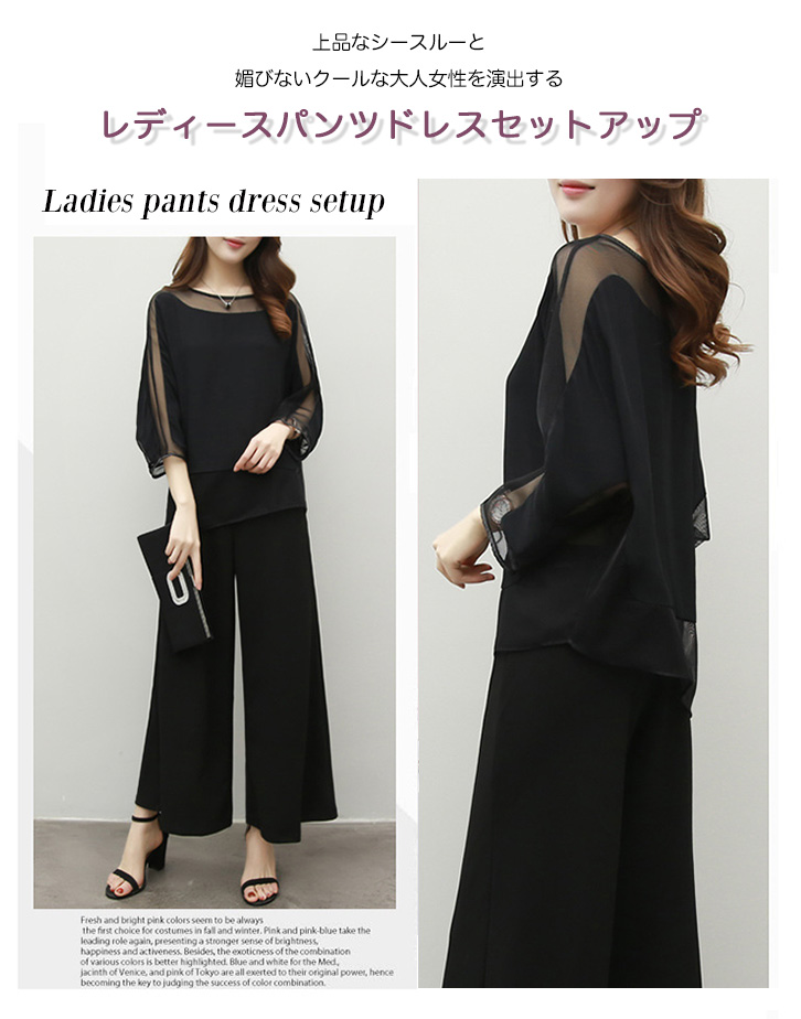 セットアップ レディース 秋冬 長袖 上下セット シースルー 大人可愛い パンツドレスセットアップ ワイドパンツ ウエストゴム 着心地抜群 快適 動きやすい シンプル セクシー おしゃれ きれいめスタイル フォーマル ブラック