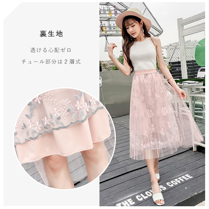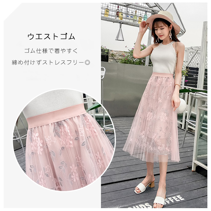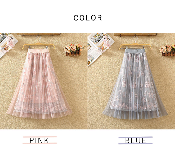 スカート ロング丈 ミモレ丈 チュールスカート チュール レディーススカート レディース 花柄 花柄スカート 花柄チュールスカート フリーサイズ かわいい ふんわり 大人可愛い 透け感 おしゃれ ブルー ピンク Aライン