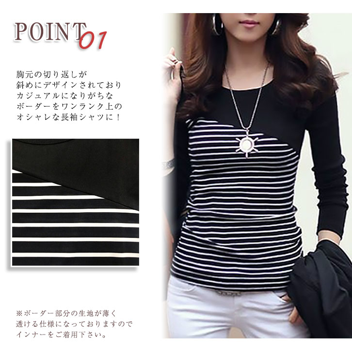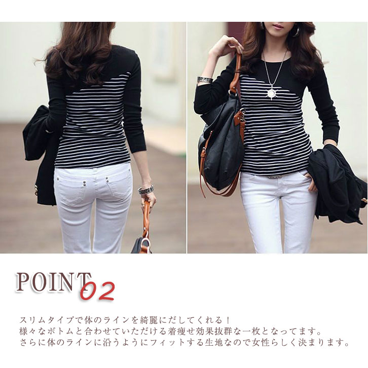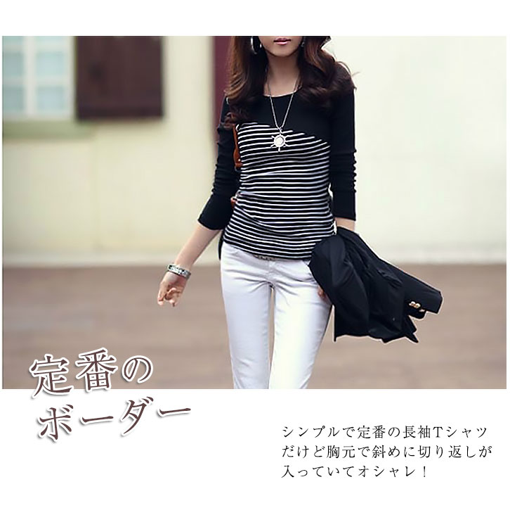 ロンT レディース 長袖 ボーダーシャツ 秋 春 冬 切り替え おしゃれ モノトーン 定番 切り返し シンプル オシャレ カジュアル 白黒 スリムタイプ 着痩せ効果 フィット きれいめ 上品 大人可愛い ホワイト ブラック