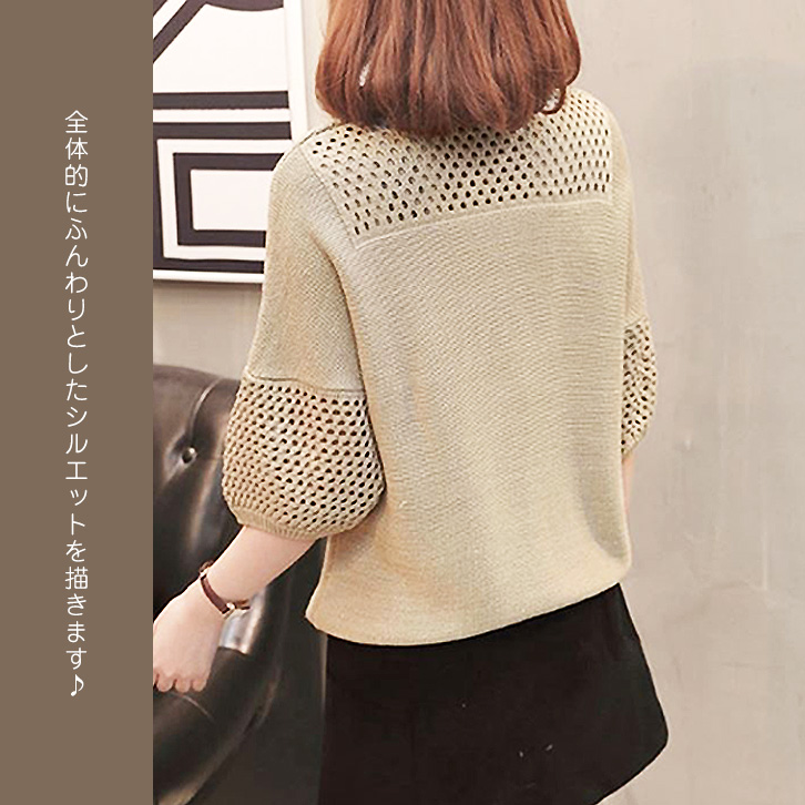 セーター レディース ニット 七分袖 おしゃれ 上品 トップス 薄手 可愛い ふんわり 体型カバー ふんわりシルエット ベージュ ピンク ブラック フリーサイズ カットソー オシャレ カジュアル 春 秋 冬 丸ネック レディースニット