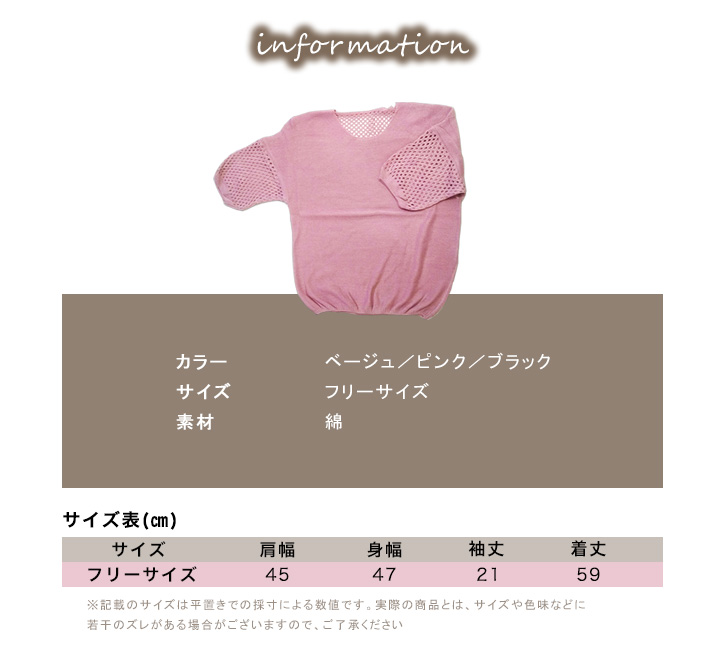 肩幅45cm、身幅47cm、袖丈21cm、着丈59cm