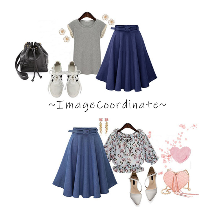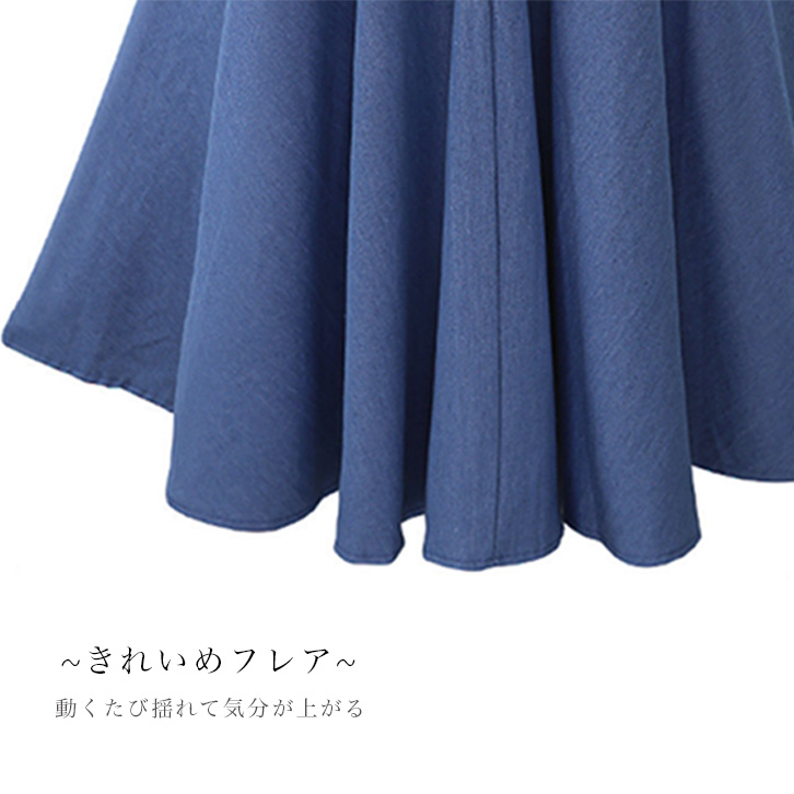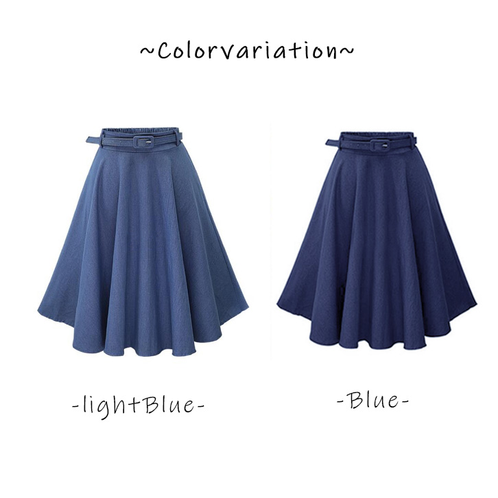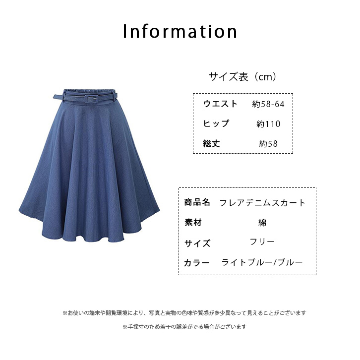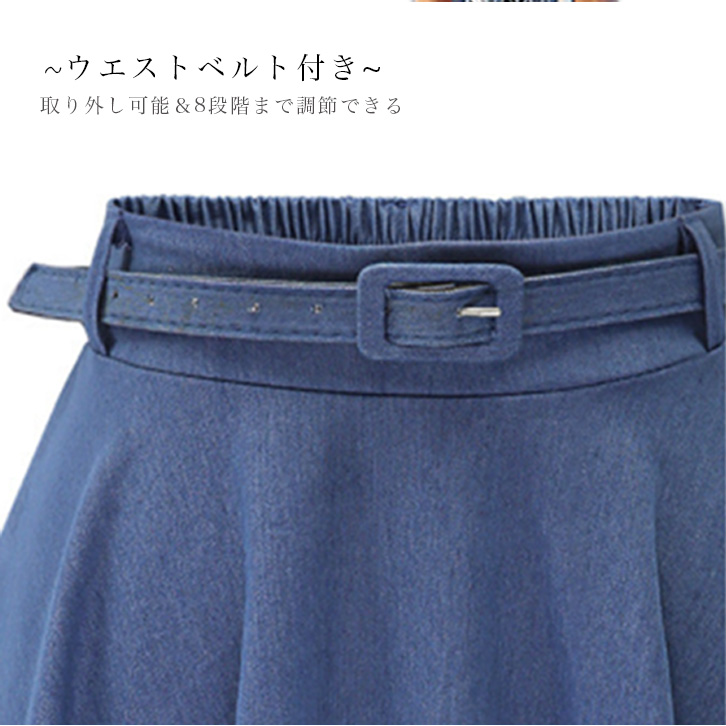 スカート デニムスカート レディース 膝丈 デニムフレアスカート デニム フリーサイズ ウエストベルト付き ウエストゴム 8段階調節可能 ベルト取り外し可能 フレア 美シルエット 定番 カジュアル 大人かわいい おしゃれ