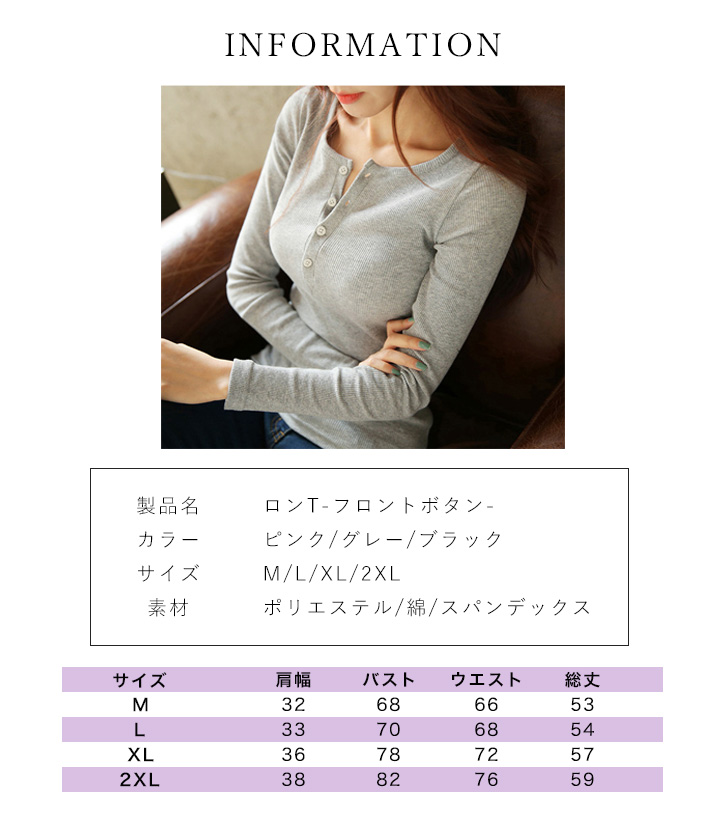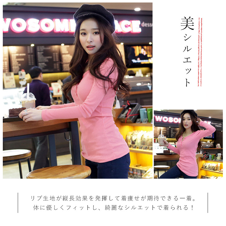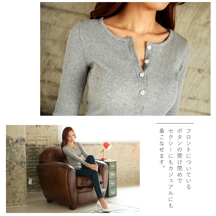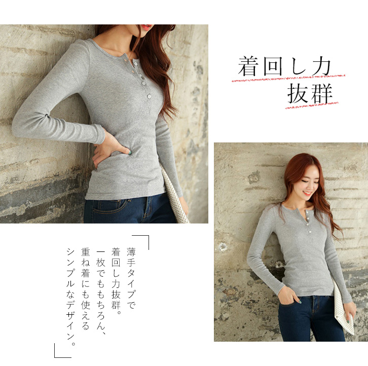 トップス ロンT レディース リブ 長袖 薄手 リブ 美シルエット 着痩せ効果 リブ生地 オールシーズン フロントボタン セクシー カジュアル シンプル 着回し抜群 重ね着 合わせやすい カットソー 全3色 ピンク グレー ブラック