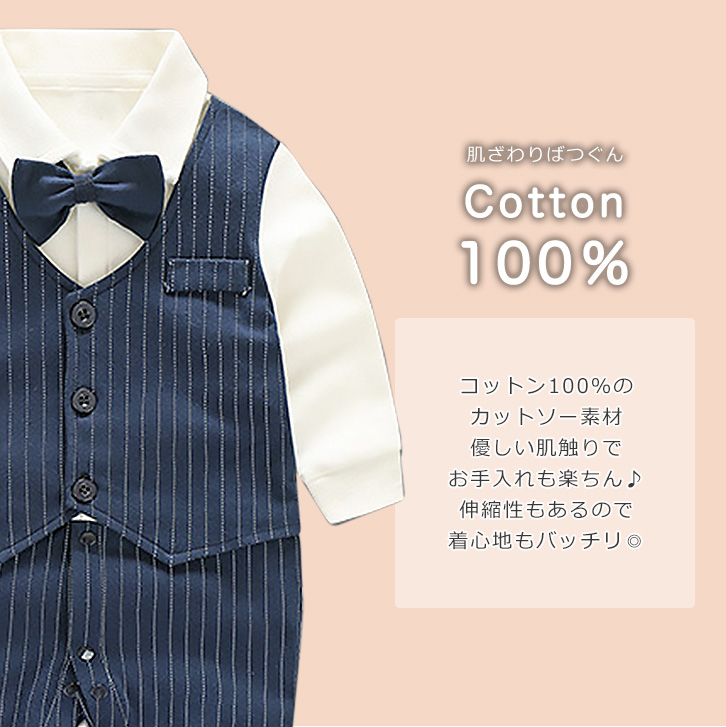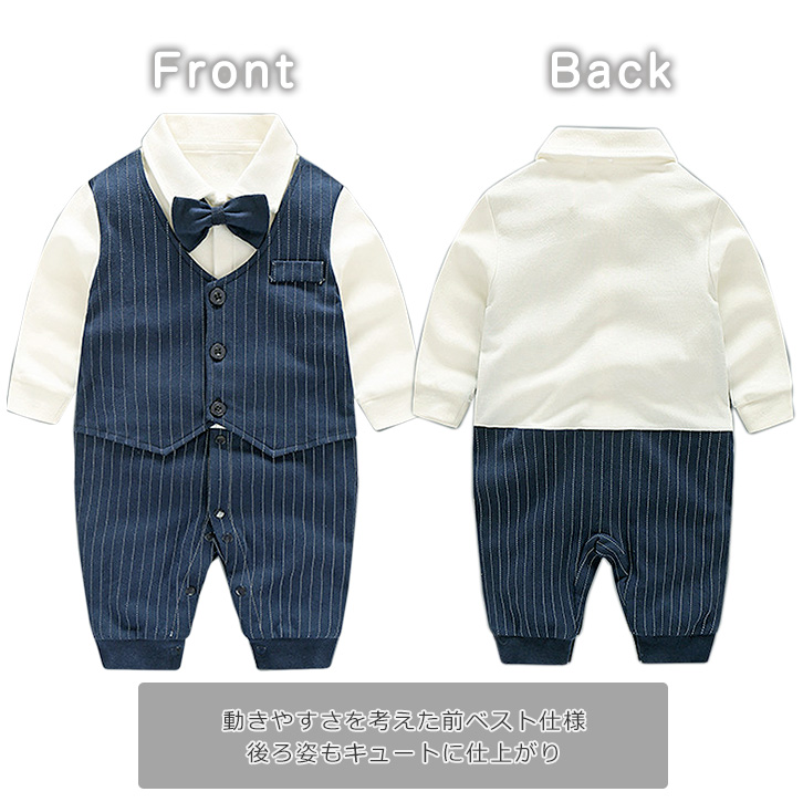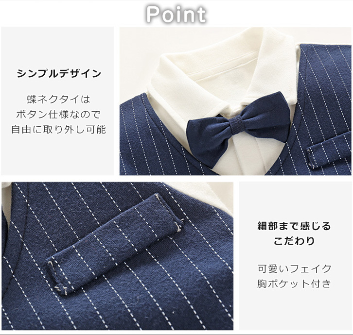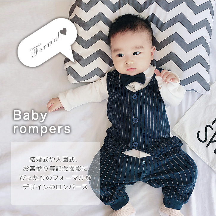 ロンパース ベビー 長袖 ベビーロンパース フォーマルロンパース かわいい スーツ 蝶ネクタイ ベスト つなぎ 肌触り抜群 コットン 優しい肌触り 着心地抜群 ボタン開閉 着脱楽々 キュート 結婚式 卒園式 記念写真