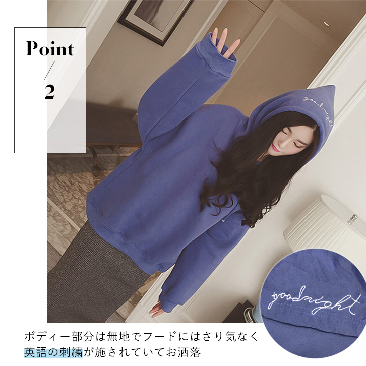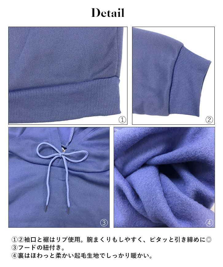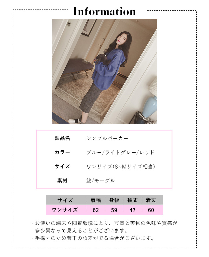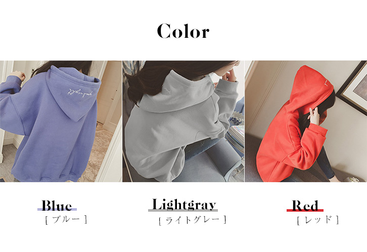 パーカー レディース プルオーバー シンプル 着回し抜群 カジュアル デイリー フード付き 裏起毛 フード紐付き リブ袖 リブ裾 英文字ロゴ 3カラー ブルー ライトグレー レッド フリーサイズ 秋 冬 長袖 かわいい おしゃれ