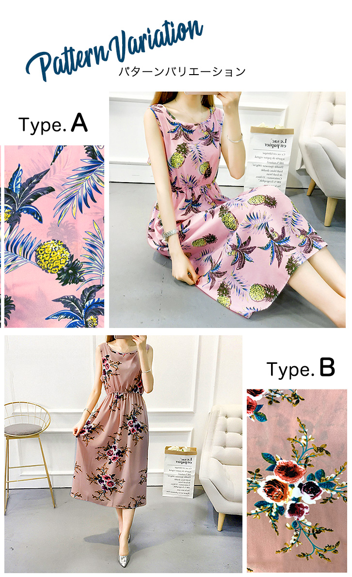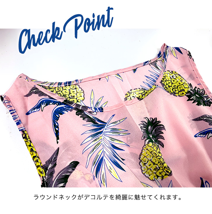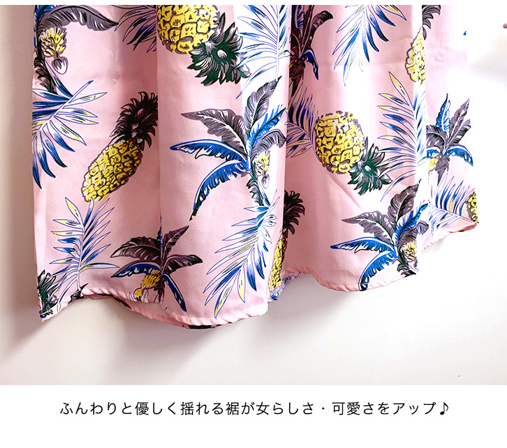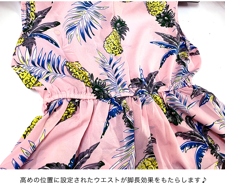 ワンピース シフォンワンピースワンピ 花柄 パイナップル トロピカル オシャレ リゾート らくちん 1枚で決まる かわいい ルームウェア ひざ下 ロング丈 ハイウエスト切り替え 透け感