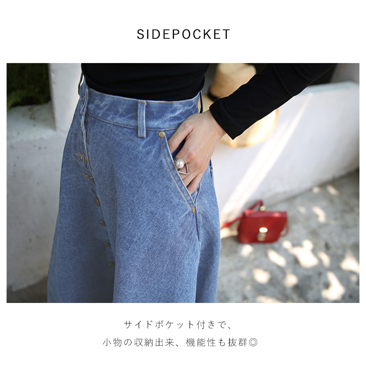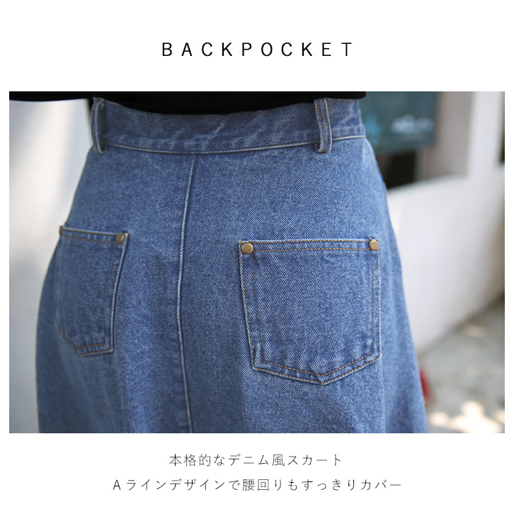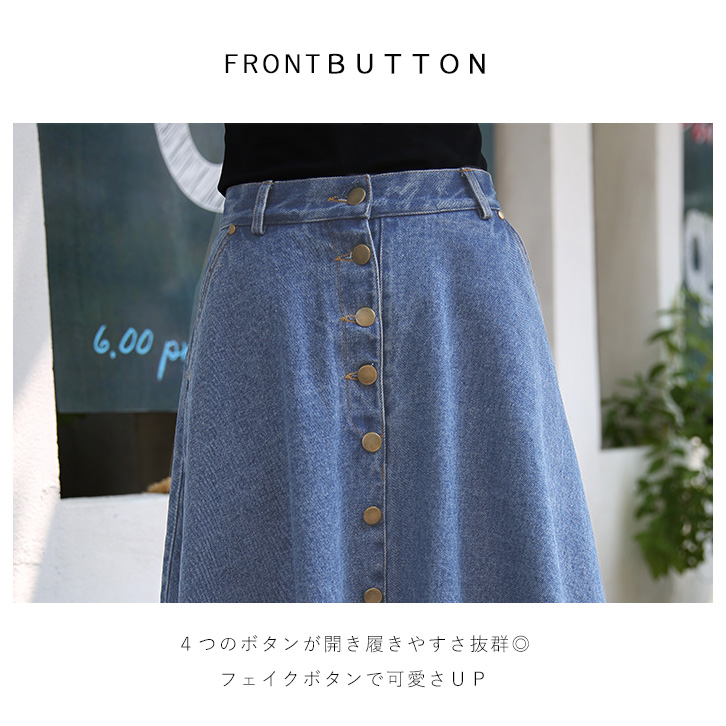 スカート レディース Aライン デニムロングスカート ロングスカート デニム 体型カバー すっきり ボタン フロントボタン フェイクボタン サイドポケット 女性らしい かわいい おしゃれ