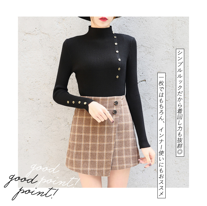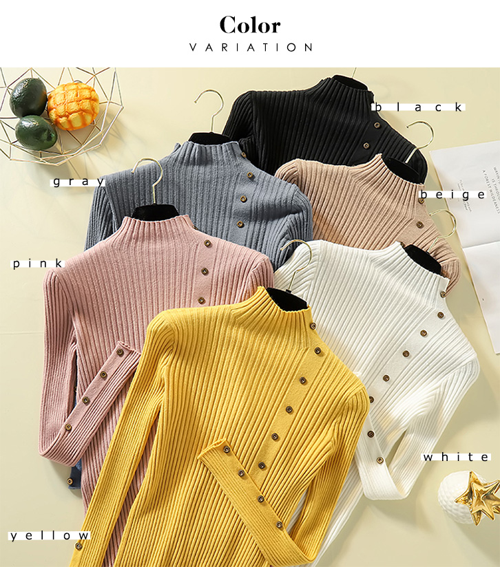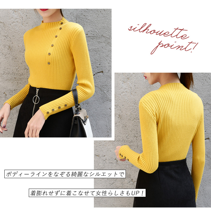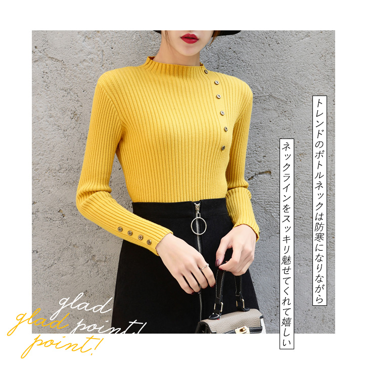 セーター レディース ニット 長袖 ネックセーター ボタン フリーサイズ ボタンネック シンプル おしゃれ 上品 着回し抜群 合わせやすい トレンド ボトルネック すっきり 美ライン 美シルエット フィット リブニット カラー豊富 全6色