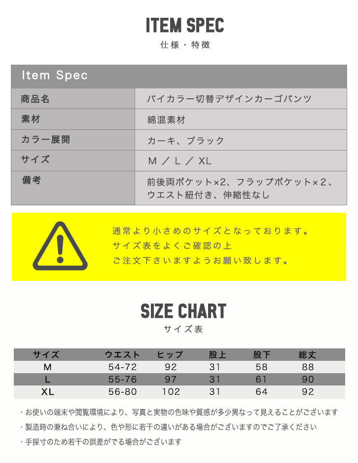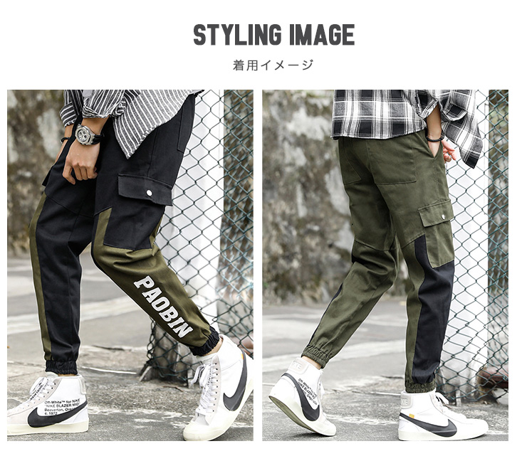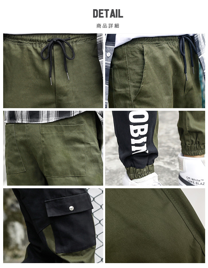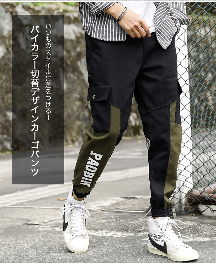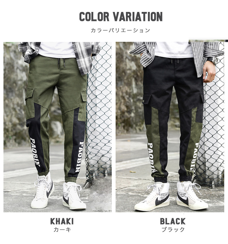 カーゴパンツ メンズ バイカラーデザイン ウエストゴム 紐調節 履き心地抜群 カーキー ブラック カジュアル アウトドア ロングパンツ 両サイドポケット ジョガータイプ すっきりシルエット 切り替えデザインカーゴパンツ