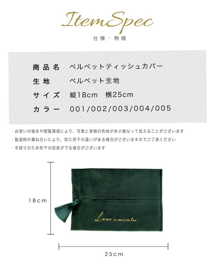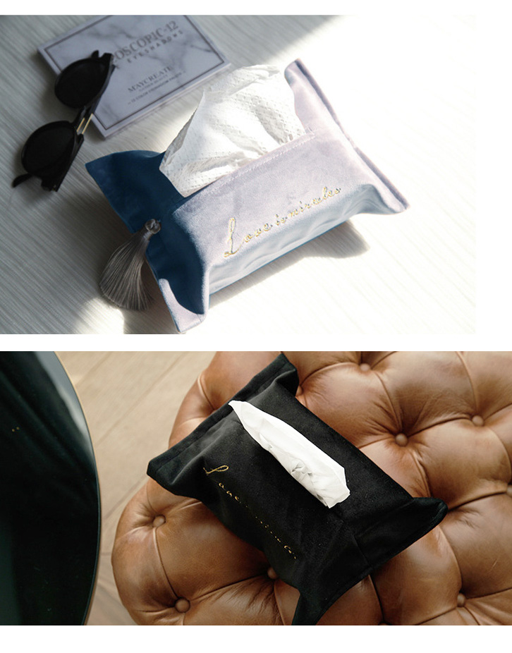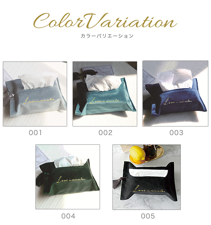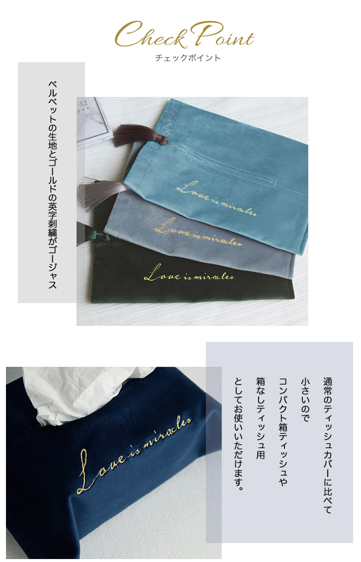 ティッシュカバー コンパクト 全5色 ベルベット生地 ゴールド英字刺繍 ゴージャス オシャレ コンパクト箱ティッシュ対応 箱なしティッシュ用 タッセル付き 高級感 インテリア マジックテープ開閉