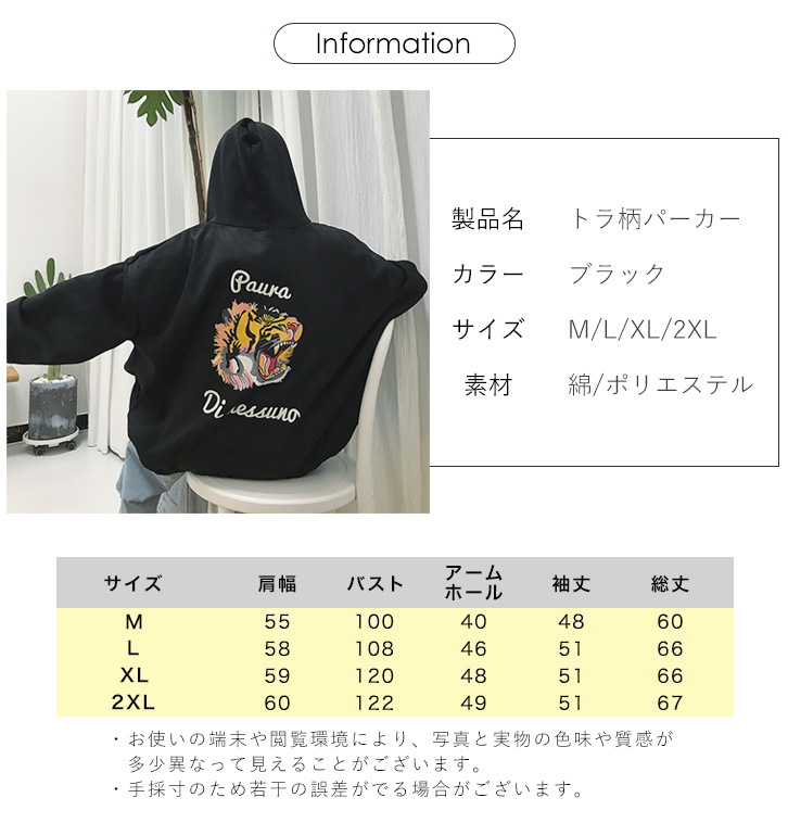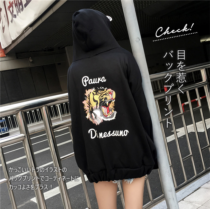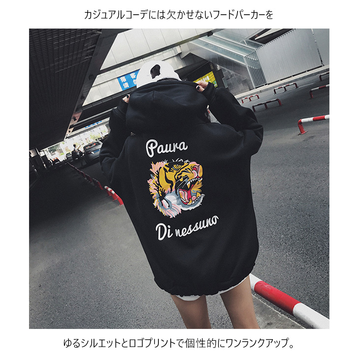パーカー レディース プルオーバー 長袖 スウェット ロゴ トラ 虎 ロゴプリントパーカー カジュアル おしゃれ かっこいい ゆるシルエット ゆったり ビッグシルエット フードパーカー バックプリント ロゴプリント 裏起毛 あったか