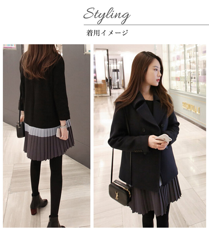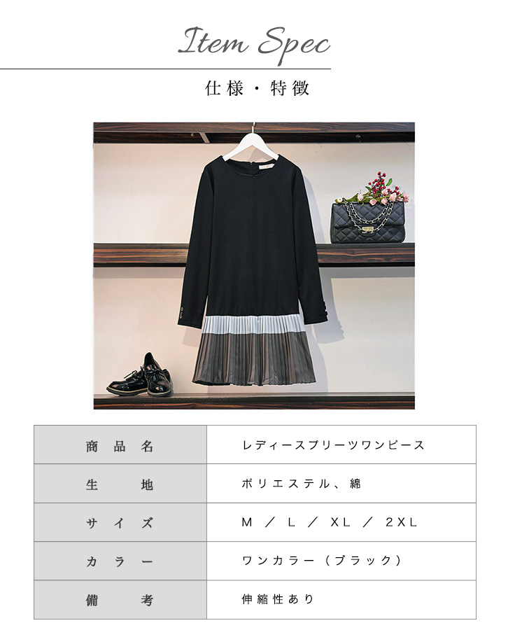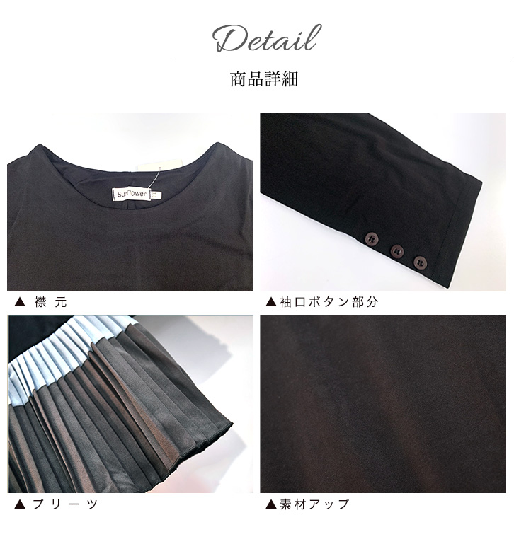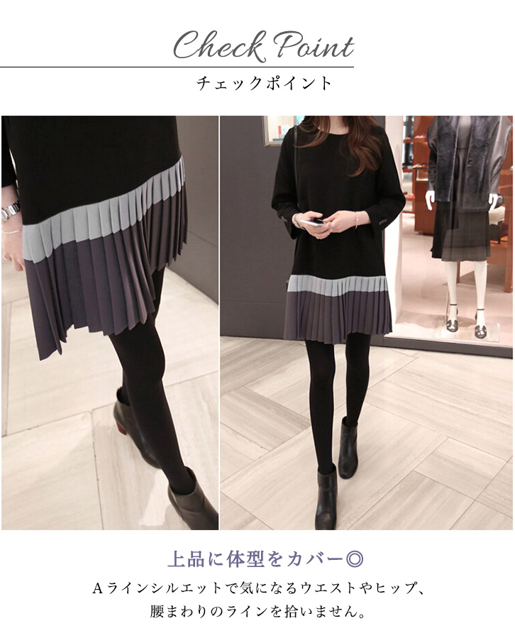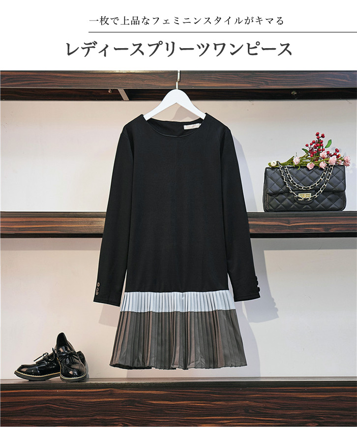 ワンピース レディース ワンピ 長袖 プリーツスカート プリーツワンピース 上品 フェミニン 女子力アップ 体型カバー Aラインシルエット 美ライン ラウンドネック 美デコルテ バイカラー 裾プリーツ かわいい