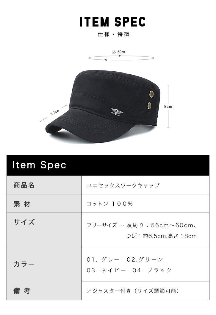 帽子 キャップ ワークキャップ ぼうし ミリタリーキャップ メンズ レディース 男女兼用 ユニセックス UV対策 日よけ シンプル 合わせやすい 通気性抜群 コットン素材 オールシーズン 快適 アジャスター付き 全4色