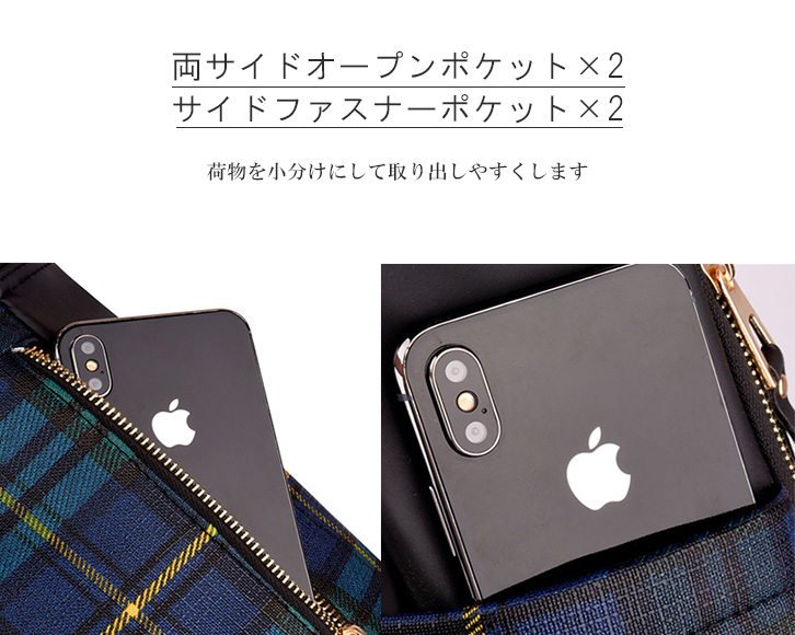 外側ファスナーポケット×2、サイドオープンポケット×2