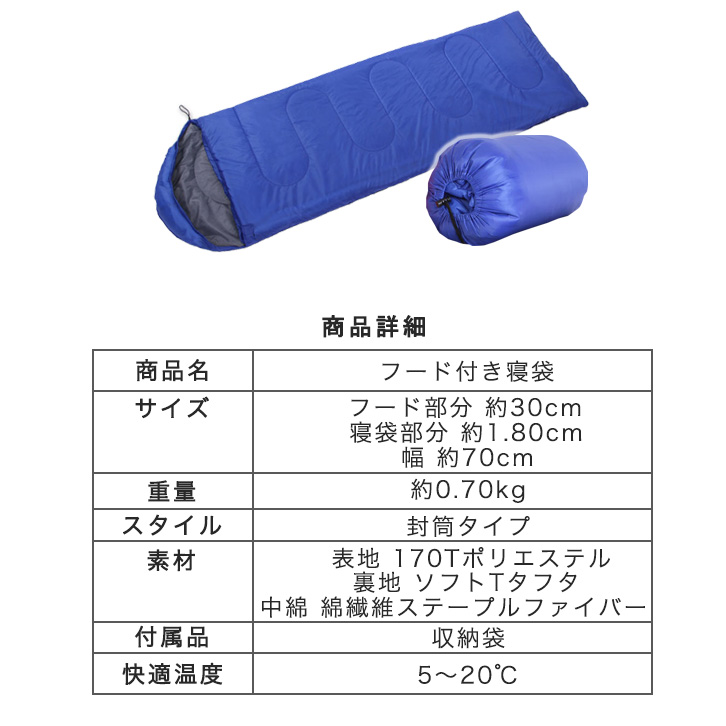 【サイズ】フード部分:約30cm/寝袋部分:約1.80cm/幅:70cm
