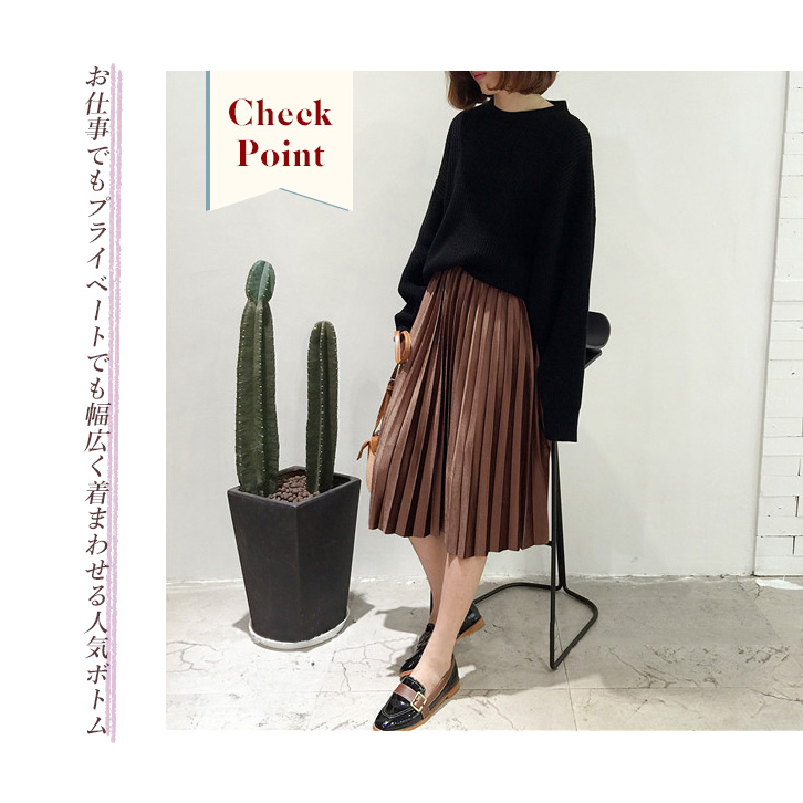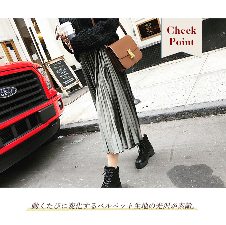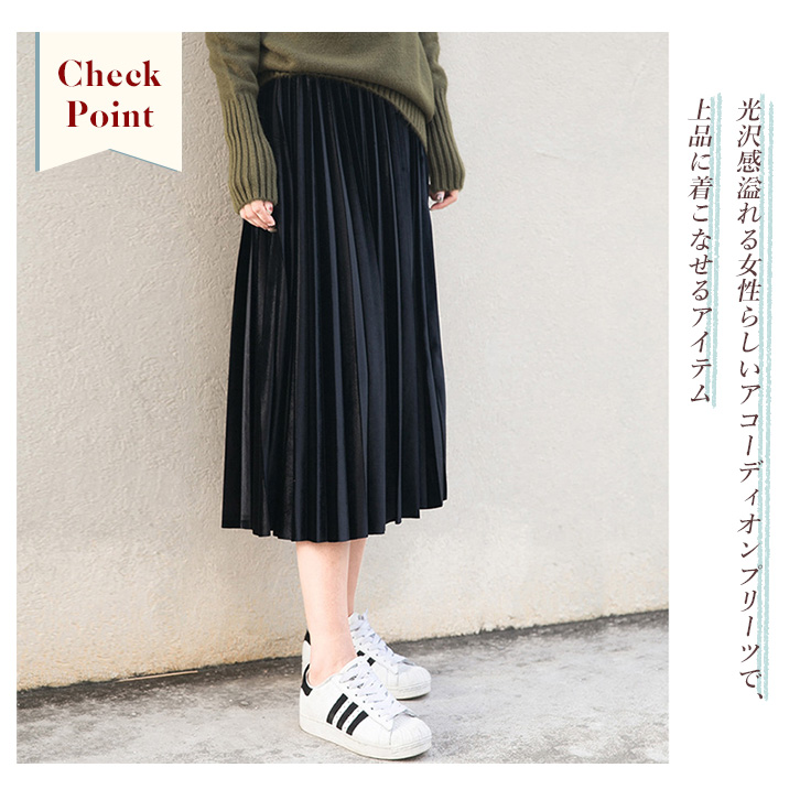 光沢感溢れる生地に女性らしいアコーディオンプリーツと 程よいミモレ丈が上品さをUP!