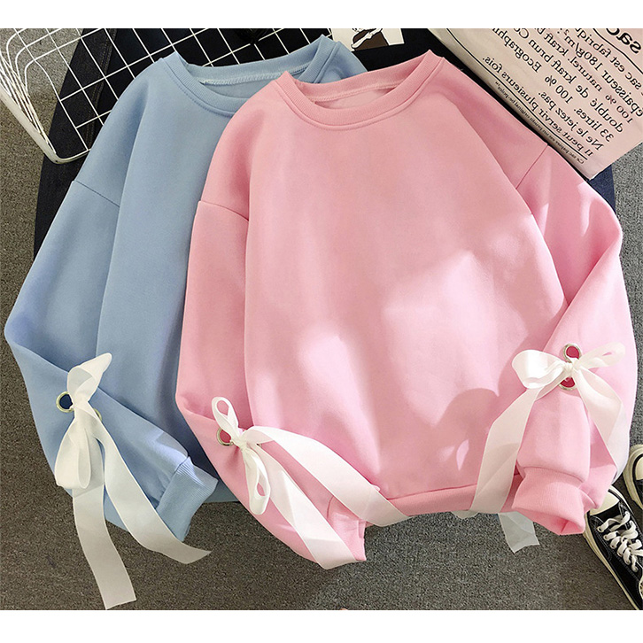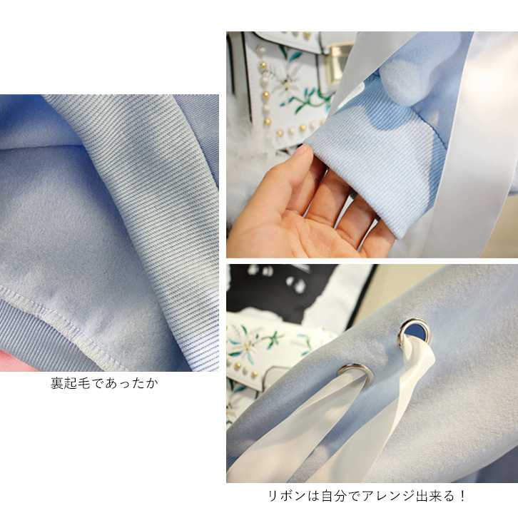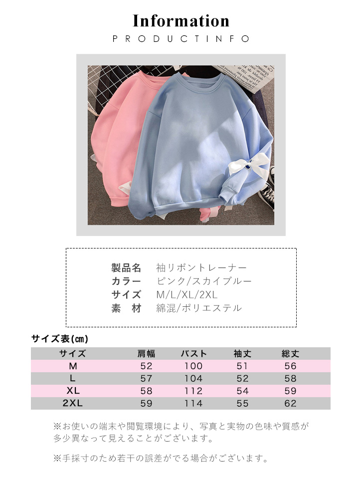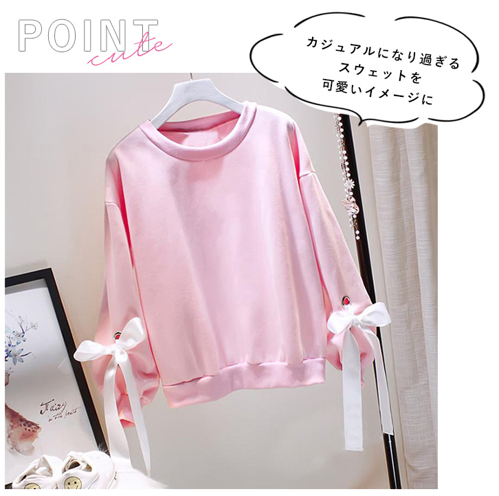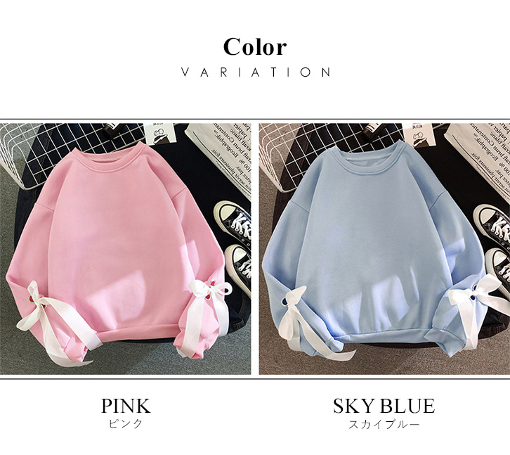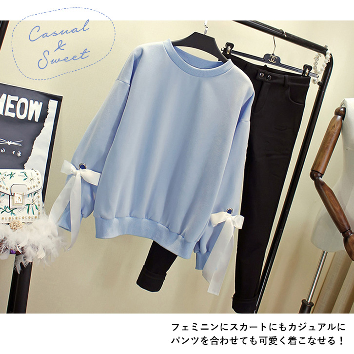 トレーナー レディース 長袖 レディーストレーナー トップス 裏起毛 袖リボン あったかい あったか 無地 シンプル かわいい 大人カジュアル スウェット風 キュート 着回し抜群 合わせやすい フェミニン リボン付き 全2色