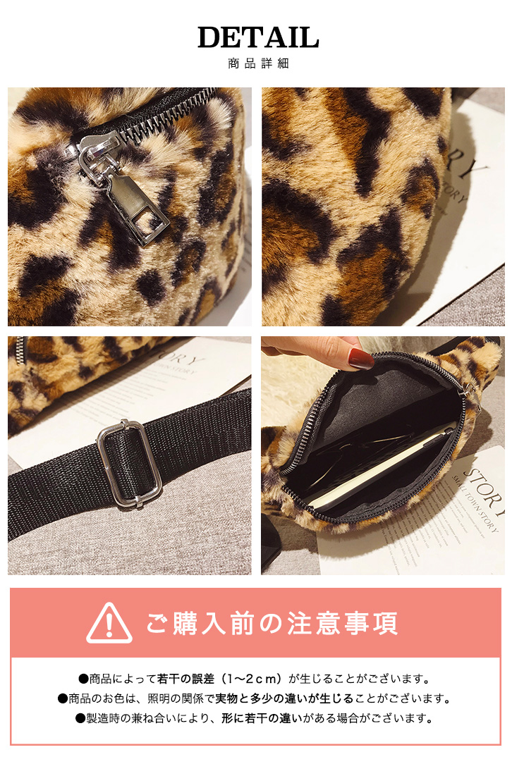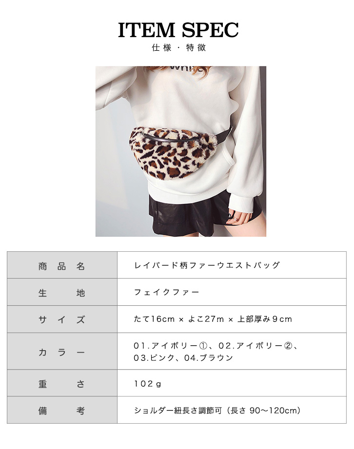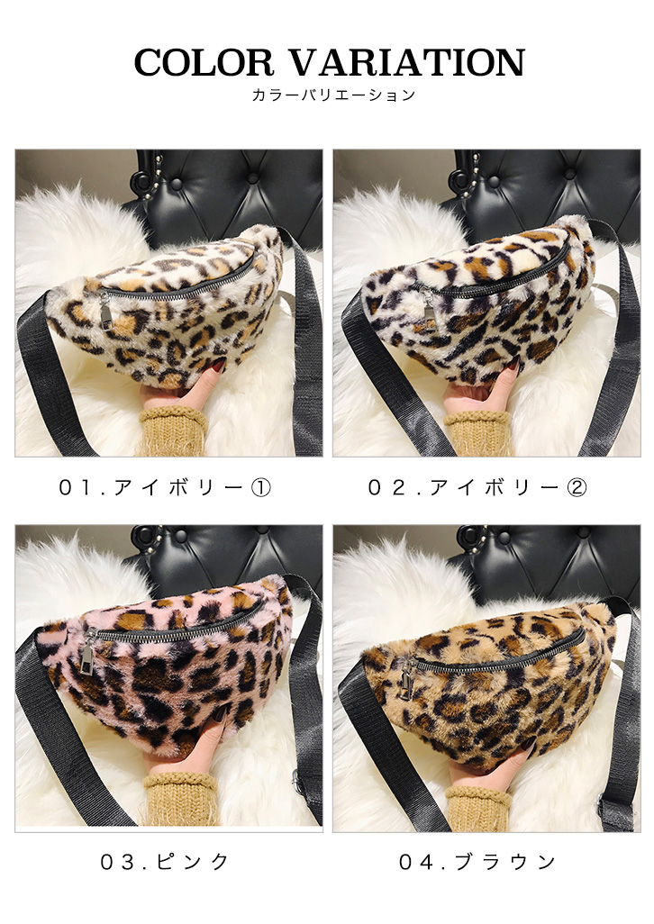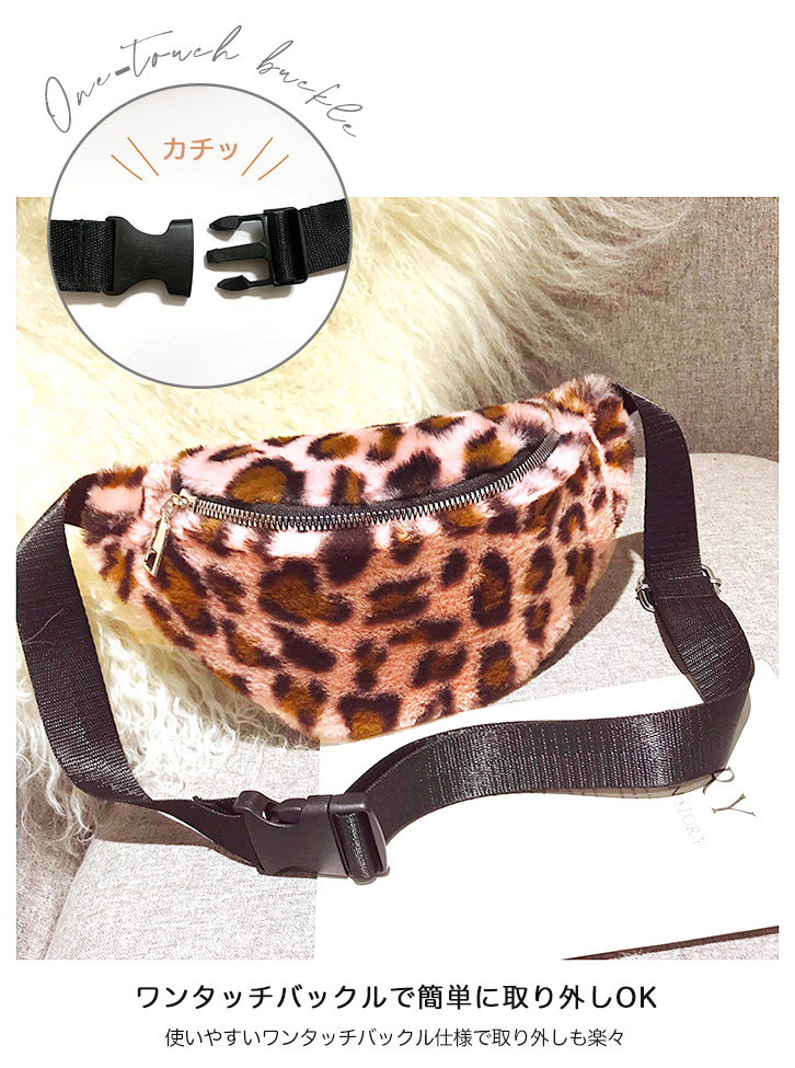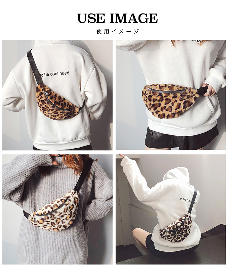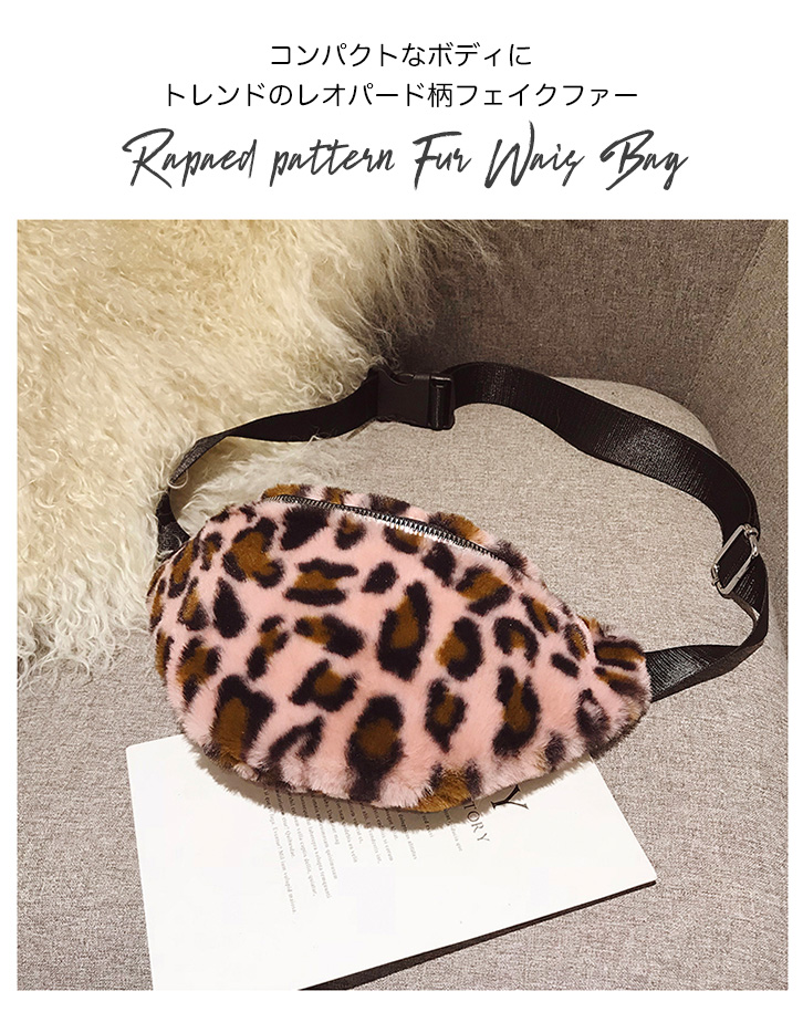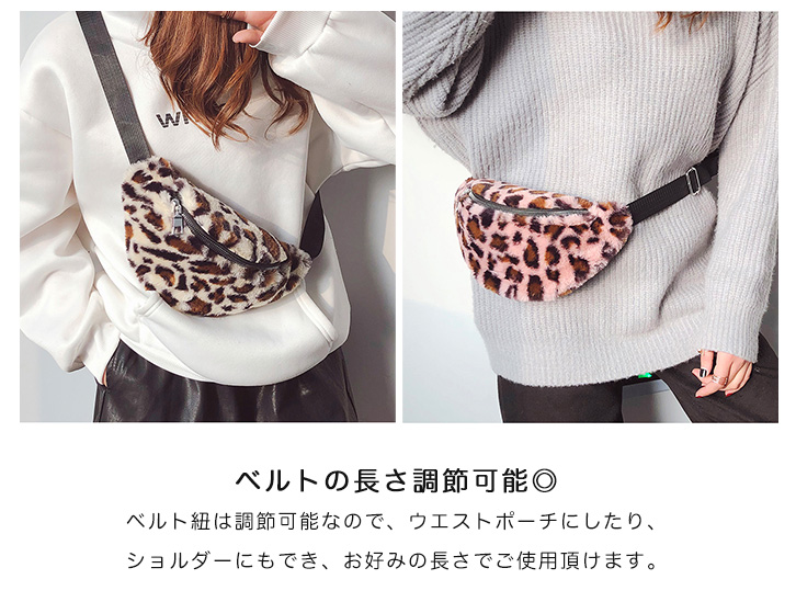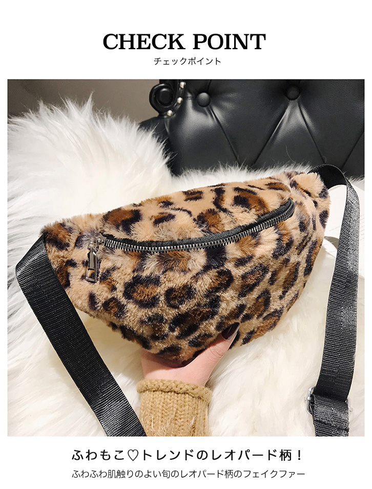 バッグ ウエストバッグ ウエストポーチ ボディバッグ ファーバッグ ふわふわ もこもこ レオパード柄 ヒョウ柄 おしゃれ かっこいい トレンド 肌触り抜群 フェイクファー ベルト長さ調節可能 ショルダー 斜め掛け 取り外し簡単
