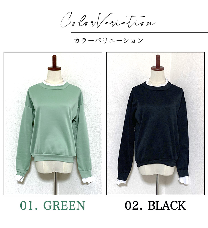 プルオーバー トレーナー 長袖 フリルプルオーバー 裏起毛 レイヤード風 重ね着風 かわいい おしゃれ 大人かわいい あったか 秋 冬 大人カジュアル デイリー 無地 シンプル グリーン ブラック ワンサイズ お洒落