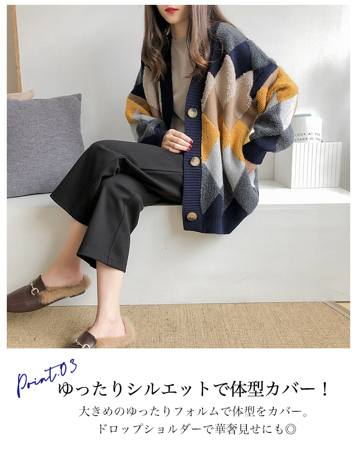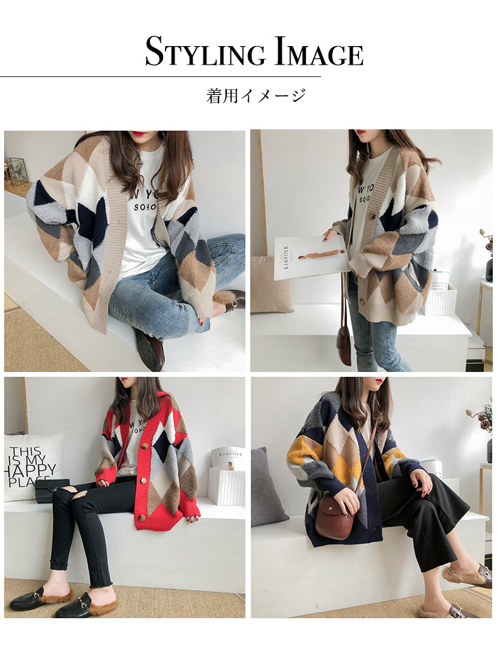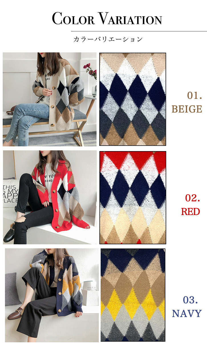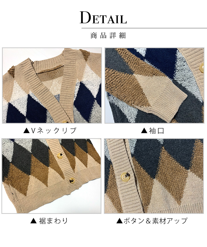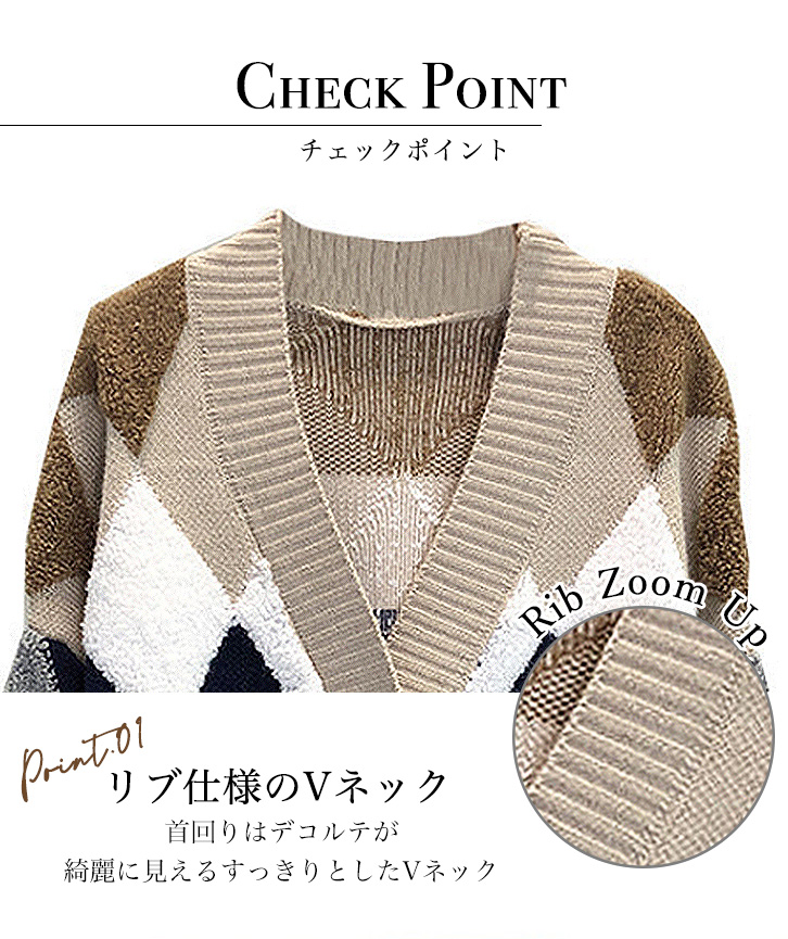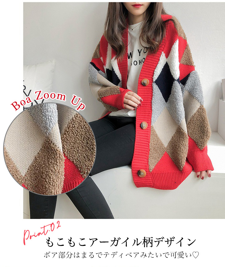 カーディガン レディース 長袖 秋 冬 アーガイル柄 チェック ワンサイズ テディカーディガン リブ仕様 Vネック もこもこ かわいい オシャレ ゆったりシルエット 体型カバー ドロップショルダー 全3カラー ベージュ レッド ネイビー