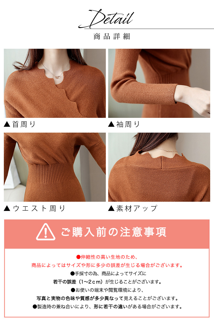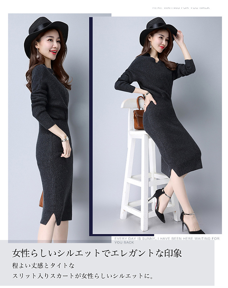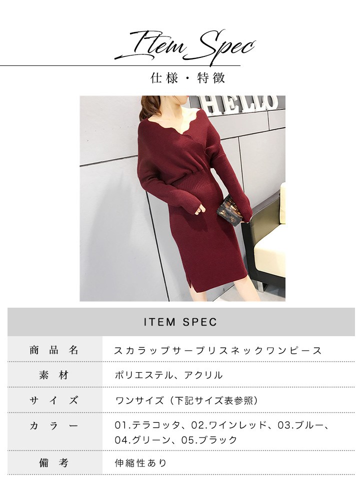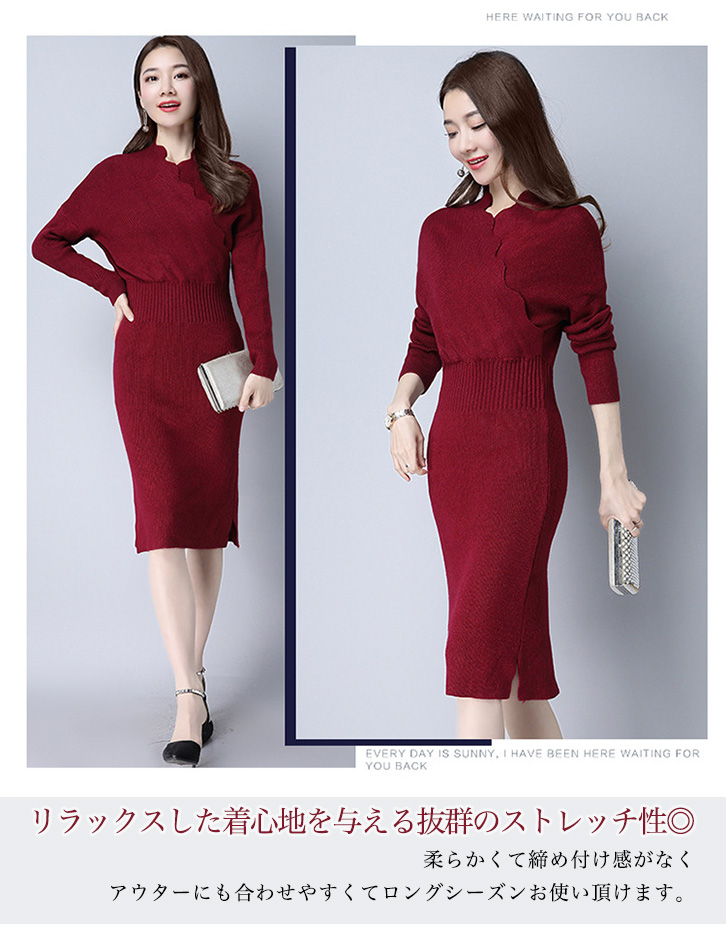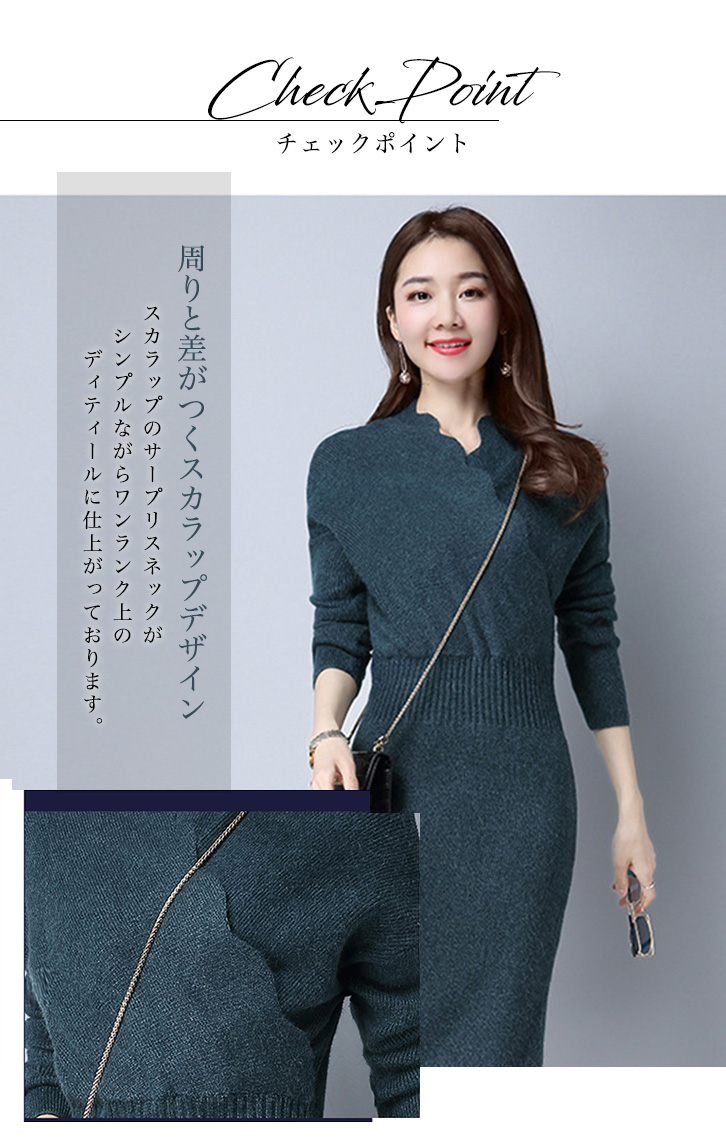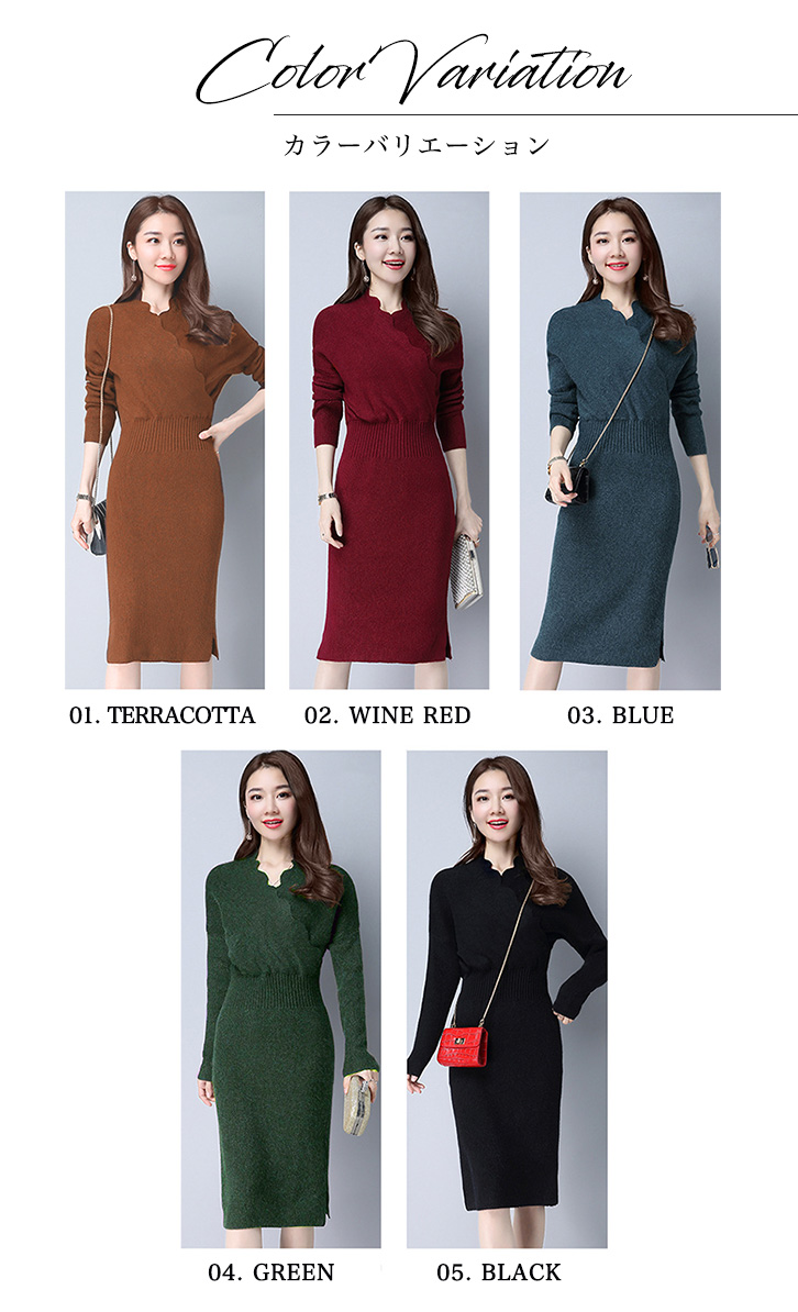 ワンピース レディース 長袖 秋 冬 春 Vネック スカラップ タイト タイトワンピース 膝丈 おしゃれ 大人かわいい きれいめ シンプル サープリスネック スリット エレガント 着心地抜群 ストレッチ カラー豊富 カラーバリエーション