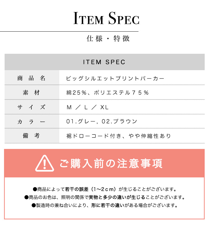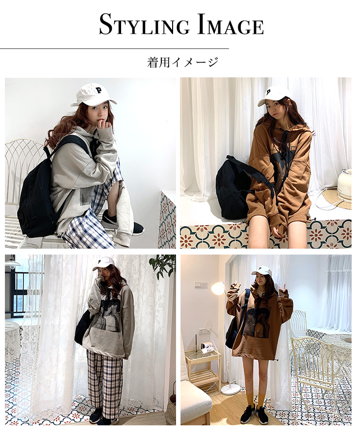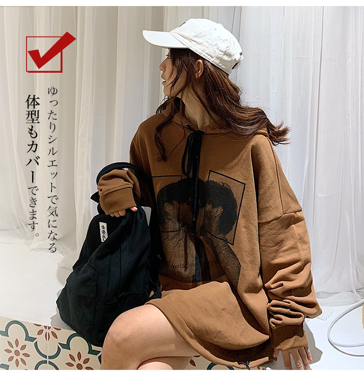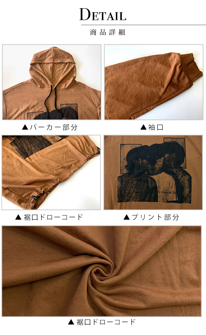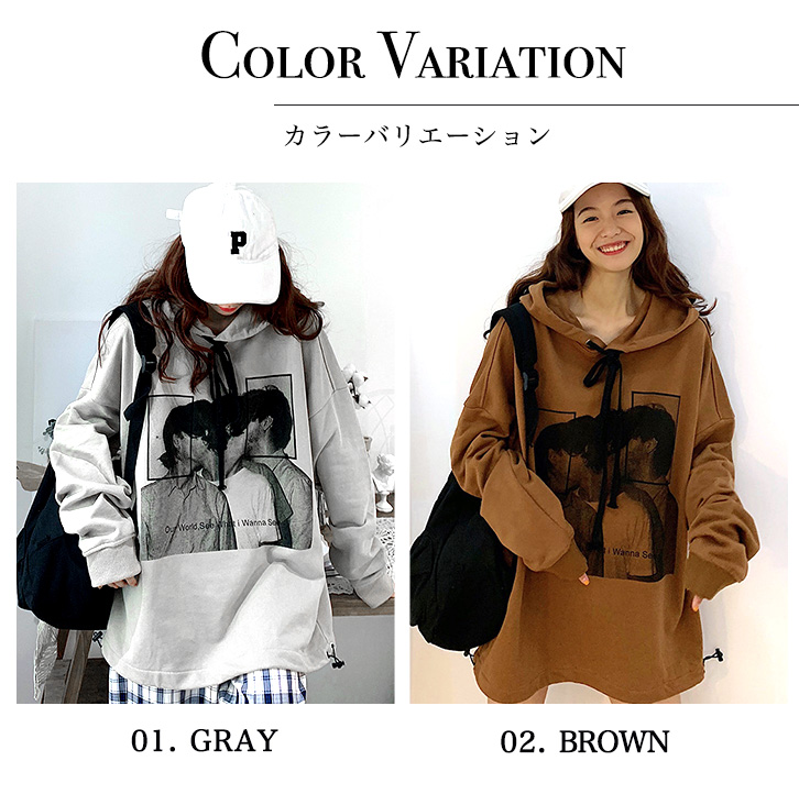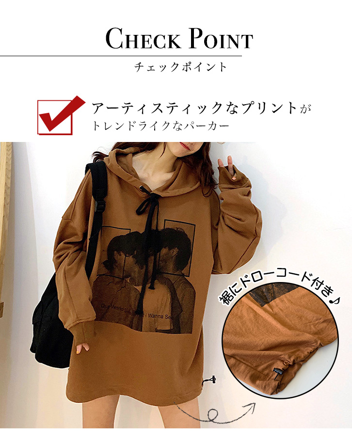 パーカー レディース プルオーバー プリントパーカー ビッグシルエット レディースパーカー おしゃれ トレンド ドローコード ゆったりシルエット 体型カバー ドロップショルダー 全2色 2カラー グレー ブラウン 着回し抜群