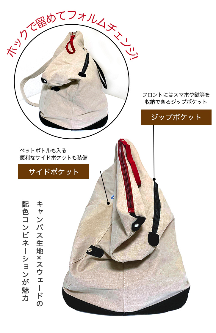 外側/ジップポケット×1、ペットボトルサイドポケット×1
