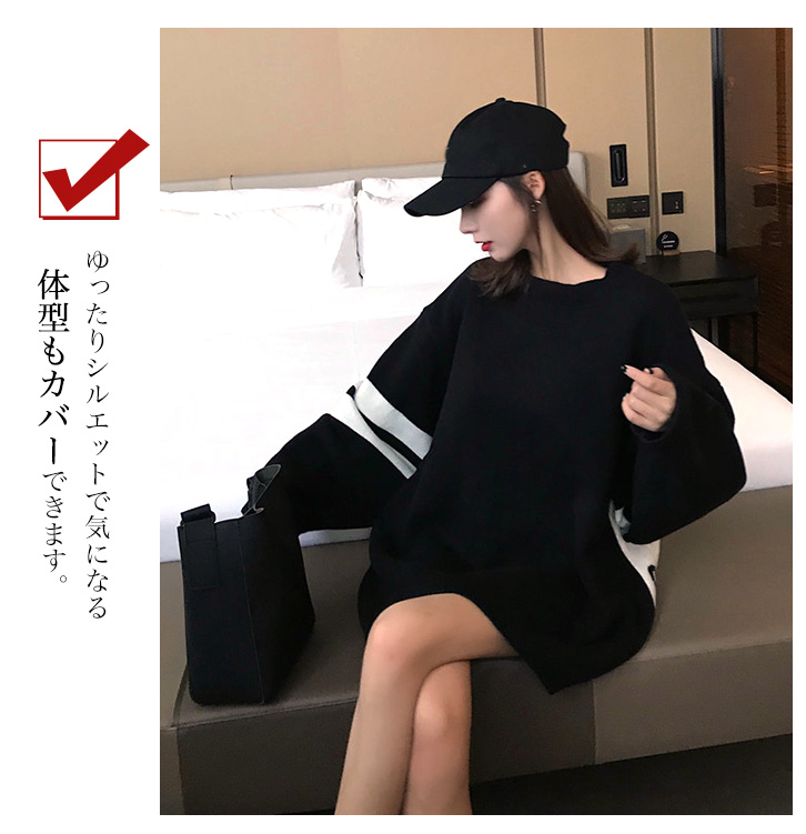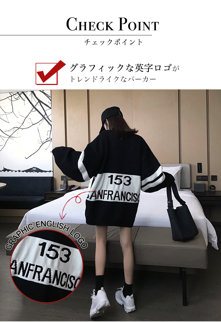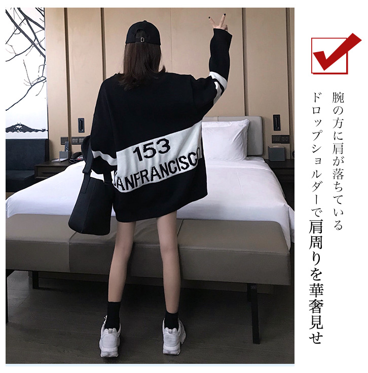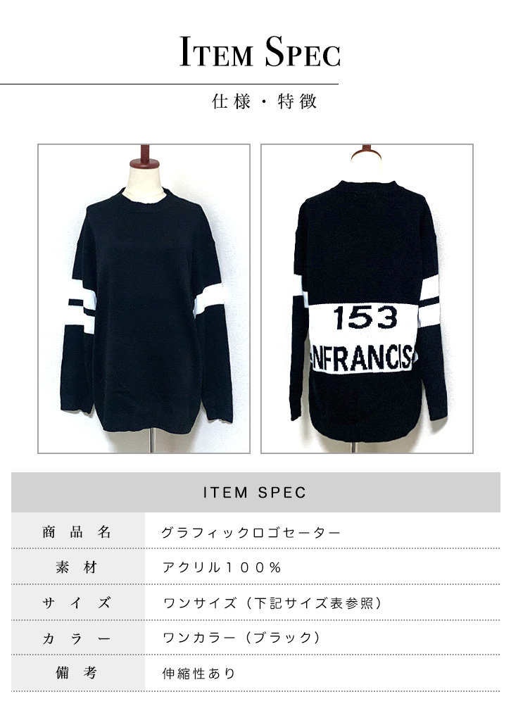 セーター レディース ニット グラフィックロゴ ロゴ入りセーター ブラック シンプル ゆったりシルエット ワンサイズ 英字ロゴ ロゴ入りセーター トレンドライク 体型カバー ドロップショルダー オシャレ スポーティー 黒白 モノトーン