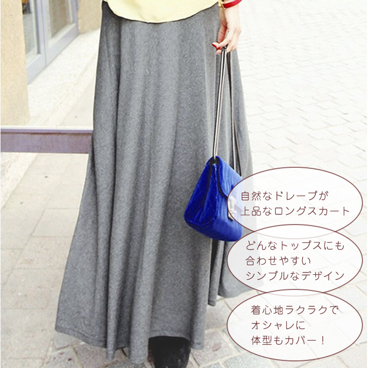 ロングスカート 秋冬 マキシ丈 無地 ドレープ 上品 シンプル 合わせやすい 着心地らくらく らくちん 体型カバー ウエストゴム ロング丈スカート ゆったり 吸湿性 肌触り抜群 モダール素材 美シルエット 全4色 フリーサイズ