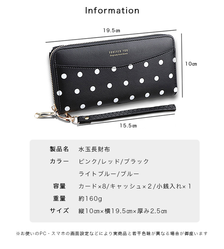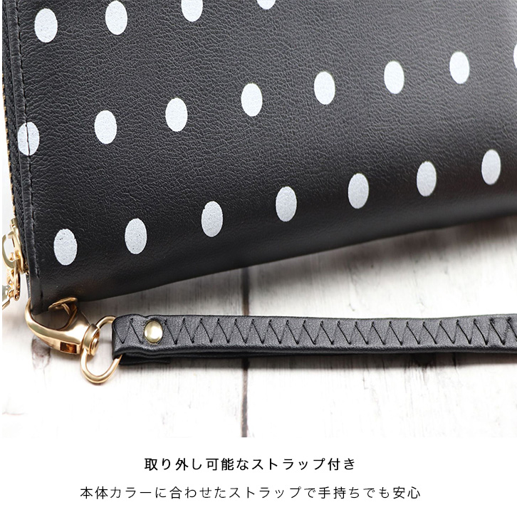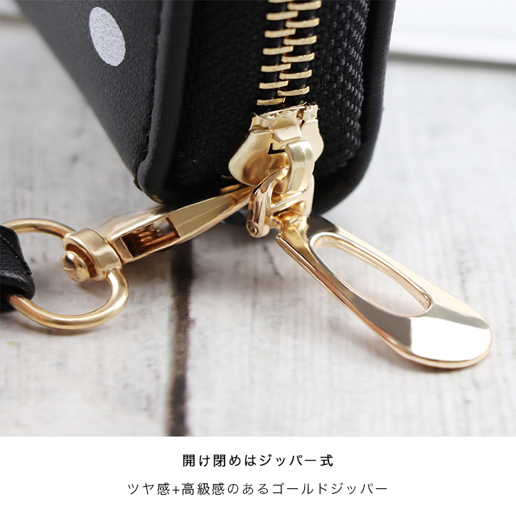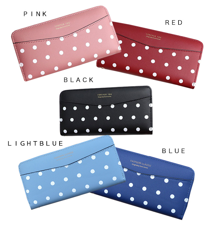 財布 レディース 長財布 ロングウォレット 水玉 カラー豊富 収納力抜群 かわいい ポップ ドット柄 ジッパー開閉 ストラップ付き キュート 水玉財布 ピンク レッド ブラック ライトブルー ブルー 全5色 5カラー カラバリ