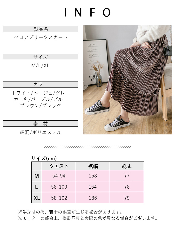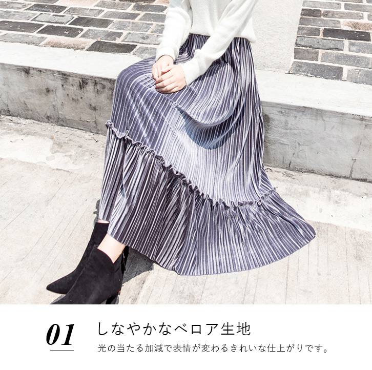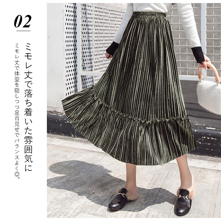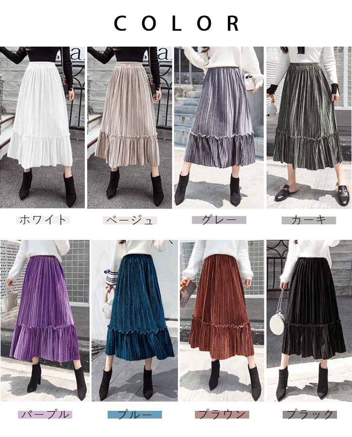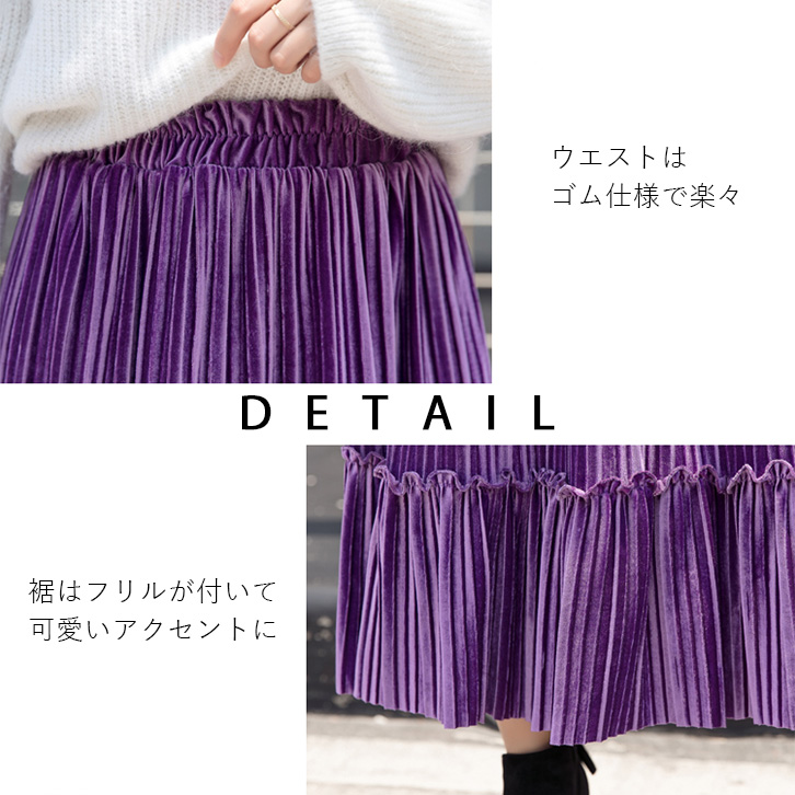スカート レディース プリーツスカート ベロア素材 ベロアプリーツスカート ミモレ丈 フリル かわいい 合わせやすい 秋 冬 ウエストゴム 可愛い カラー豊富 カラーバリエーション豊富 全8色 大人カジュアル 大人かわいい
