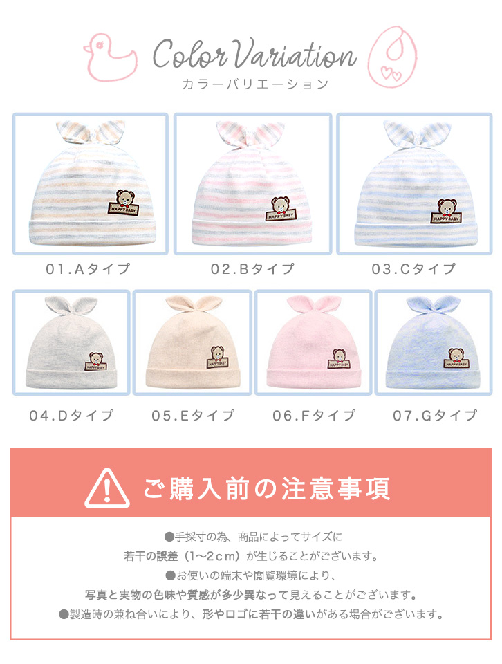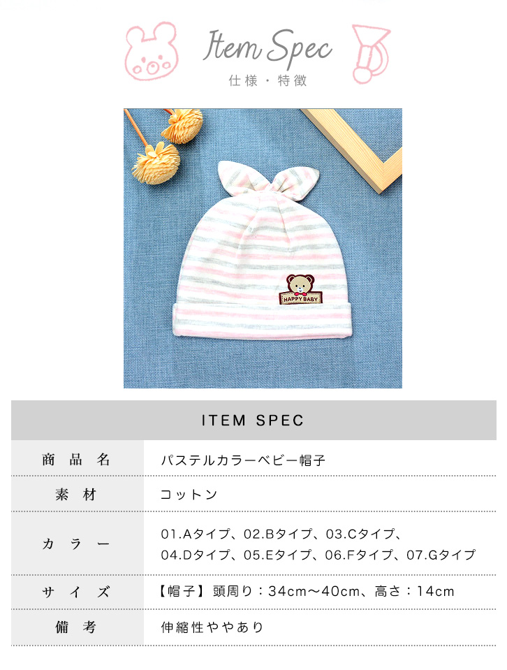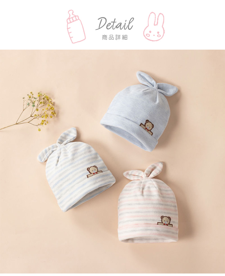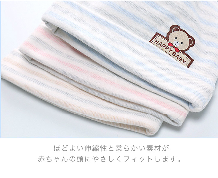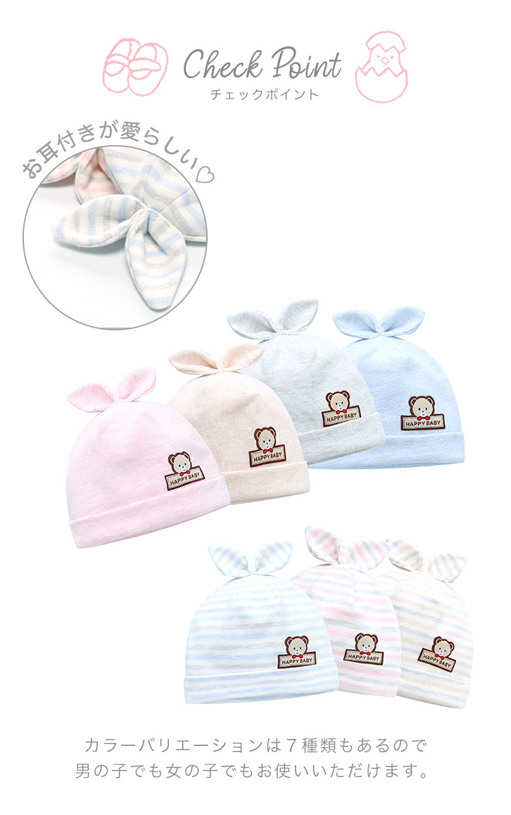 帽子 ベビー帽子 オールシーズン かわいい コットン 肌触り抜群 くまちゃん ワンポイント パステルカラー カラー豊富 カラーバリエーション 男の子 女の子 耳付き ボーダー 無地 キャップ ハット ふんわり 軽い 肌触り快適