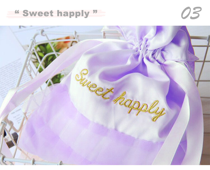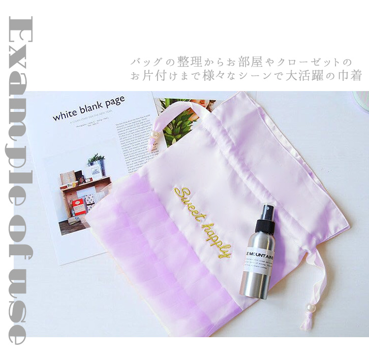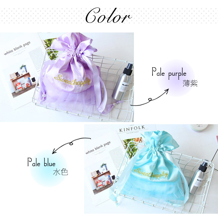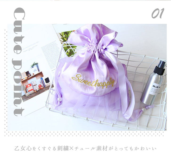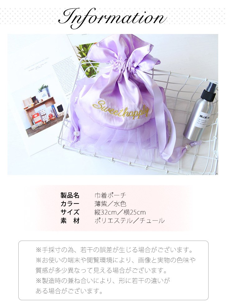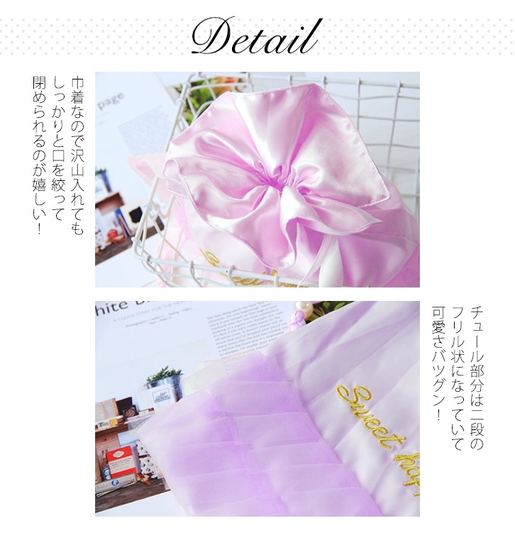 巾着袋 巾着ポーチ ポーチ 小物 メイクポーチ 化粧ポーチ コスメポーチ サニタリーポーチ マルチ巾着ポーチ かわいい 刺繍 チュール素材 巾着 フリル キュート 可愛い おしゃれ 全2カラー 薄紫 水色 オシャレ