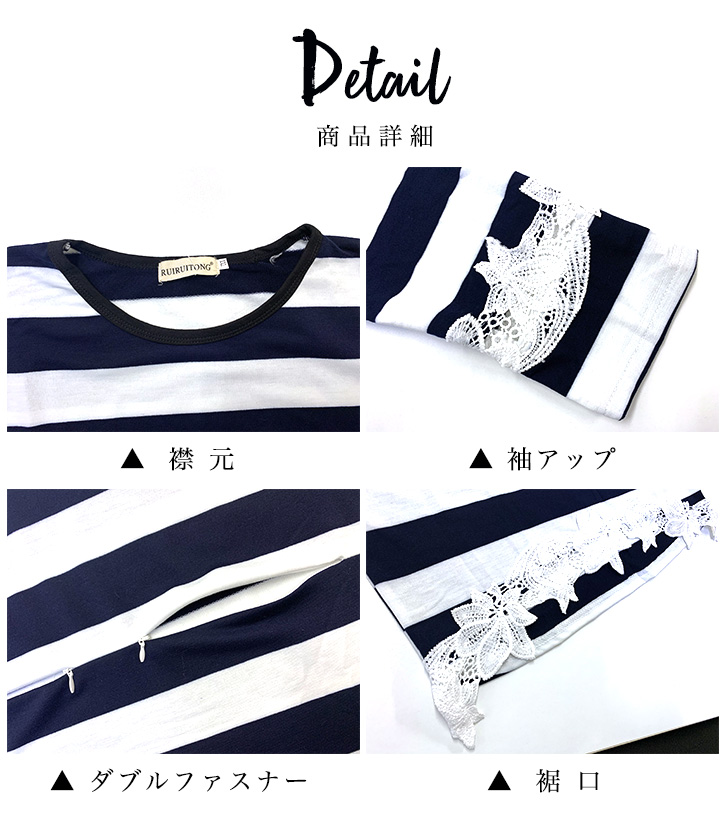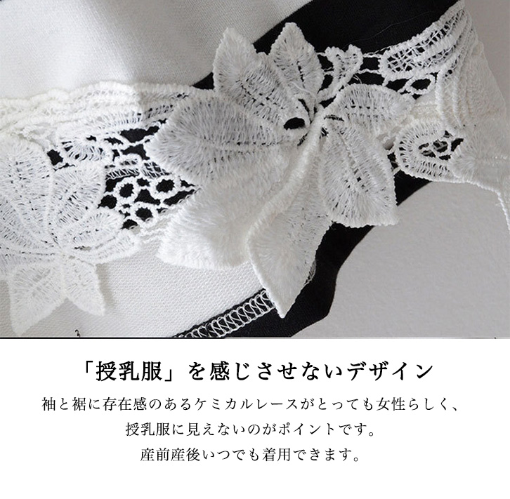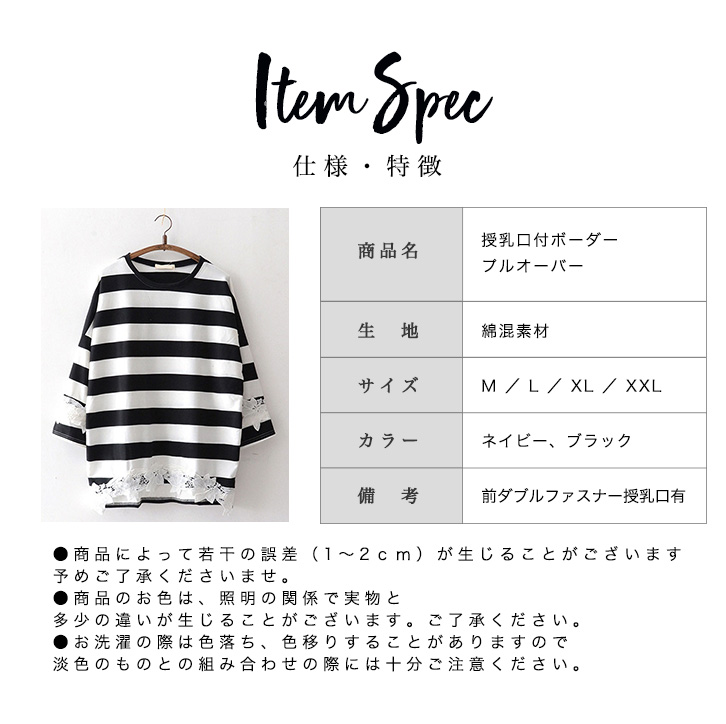 トップス 授乳服 マタニティ服 プルオーバー ボーダープルオーバー 授乳口付き 産前 産後 前ファスナー授乳口 ゆったりシルエット 体型カバー おしゃれ ケミカルレース かわいい 着心地快適 吸湿性 肌触り抜群