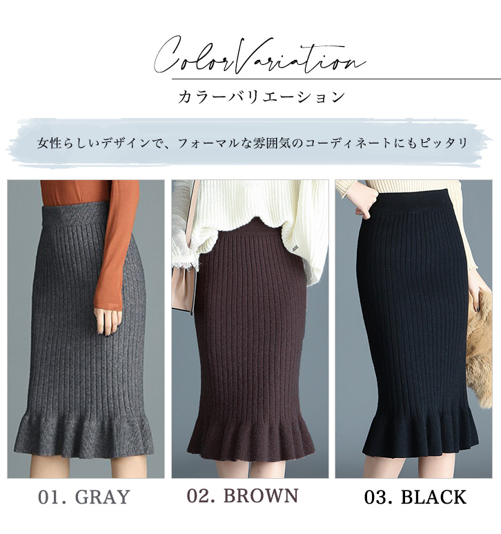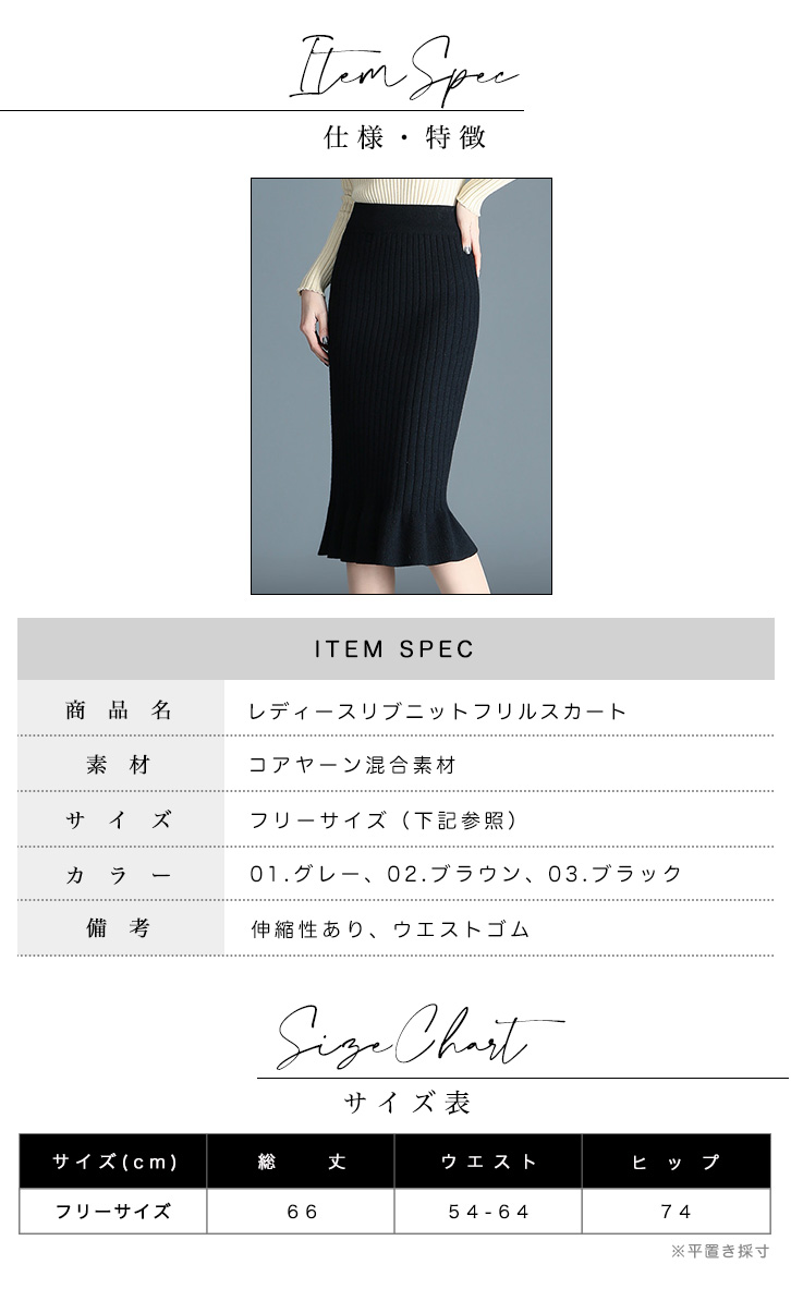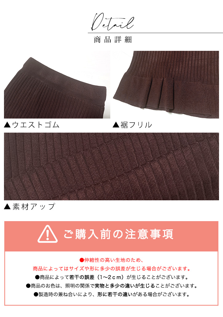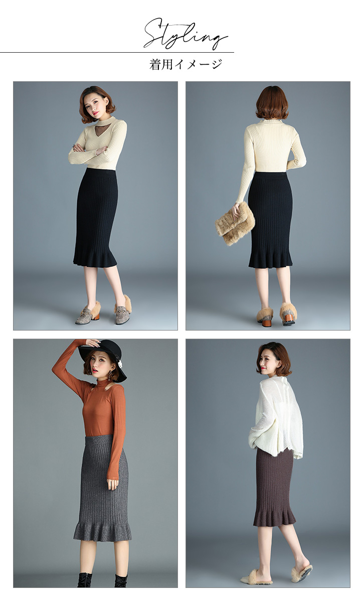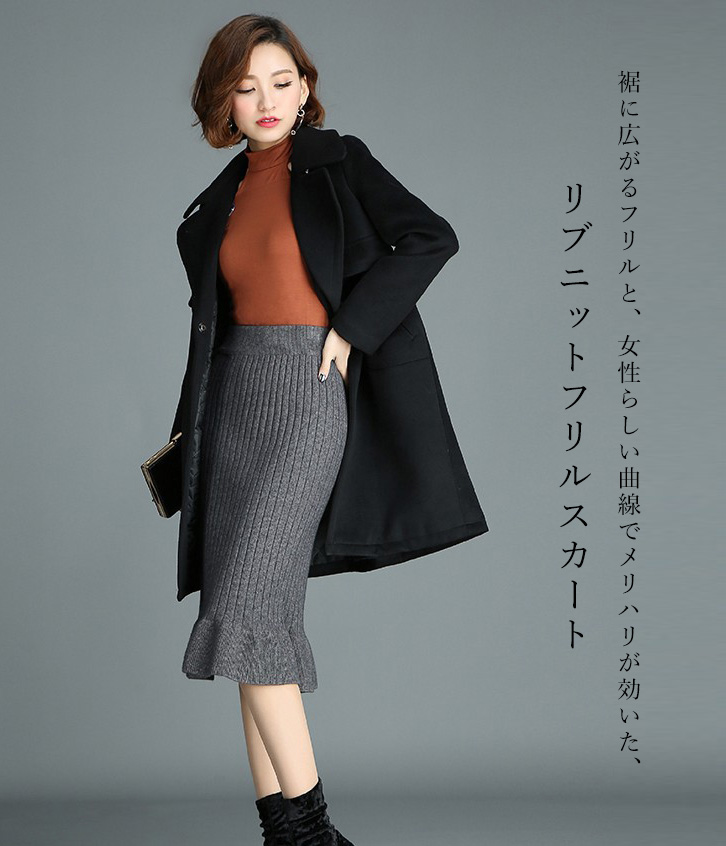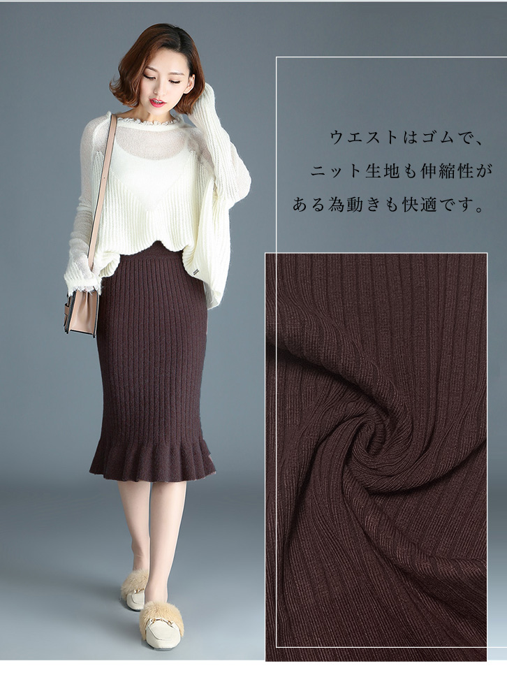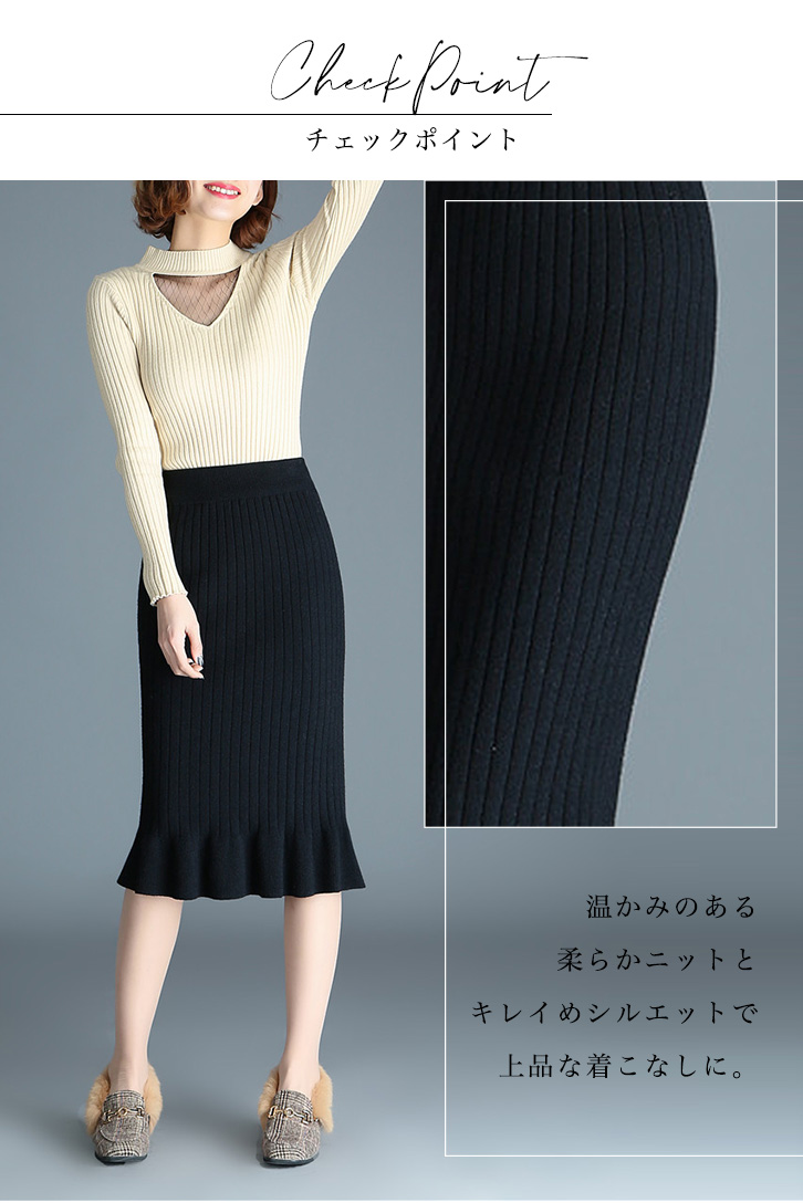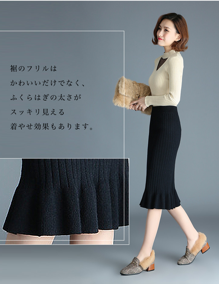 スカート レディーススカート 膝下丈 ミモレ丈 リブニットスカート フリルスカート 美シルエット タイトスカート リブニットフリルスカート きれいめ おしゃれ シンプル シンプル 上品 ニットスカート 着やせ 伸縮性抜群 らくちん