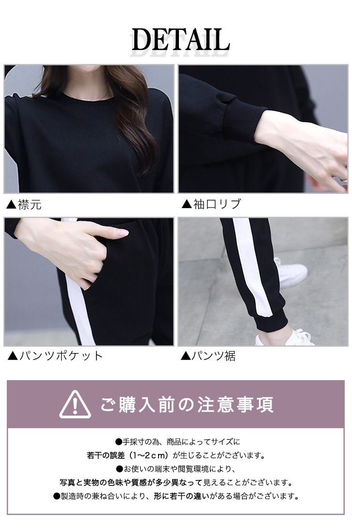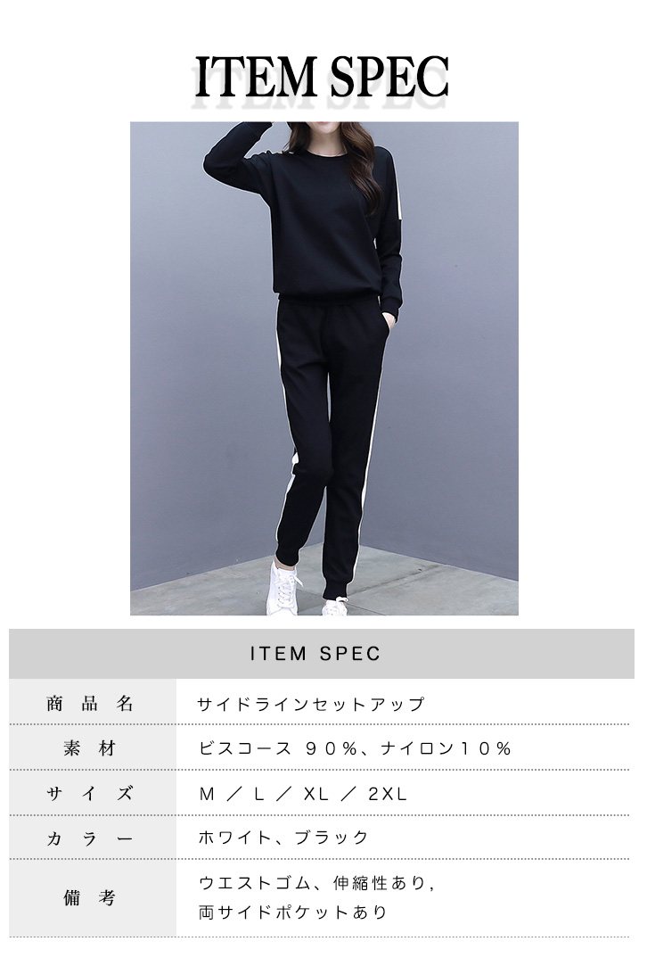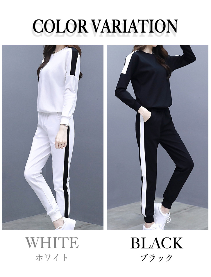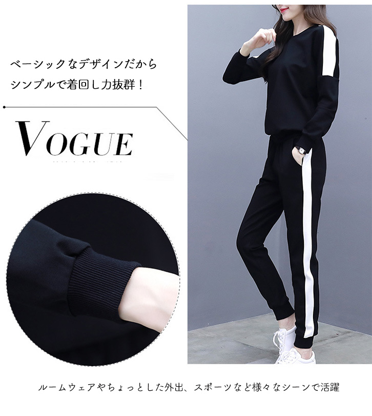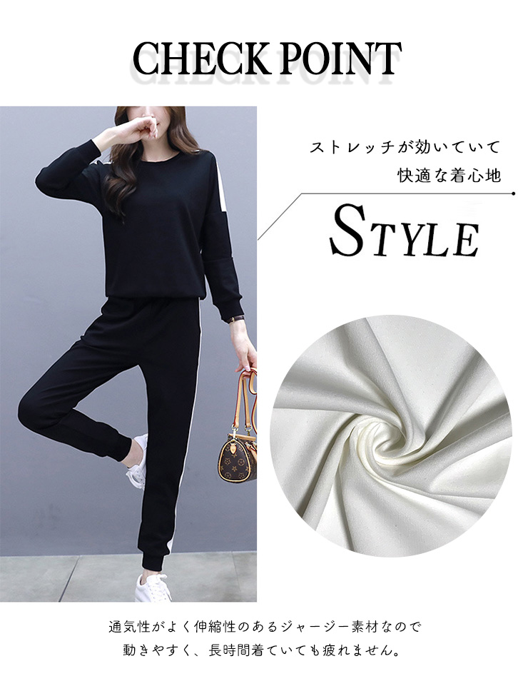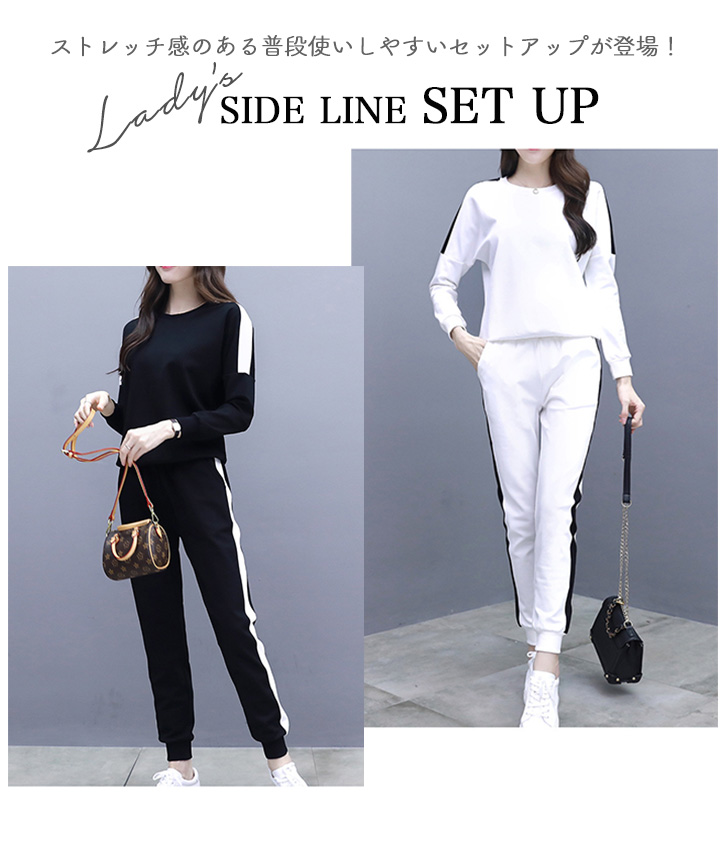 セットアップ レディース 長袖 長ズボン スポーティー サイドライン おしゃれ トレンド シンプル ストレッチ デイリー ルームウェア 部屋着 着心地抜群 ジャージ風 通気性抜群 伸縮性 らくちん スポーツ ベーシック ブラック ホワイト