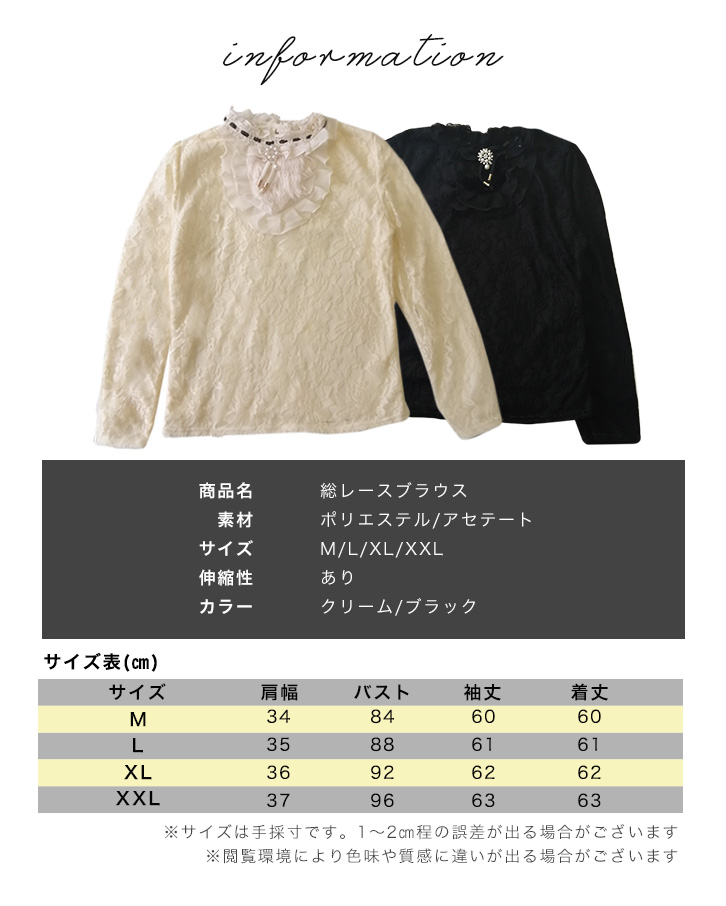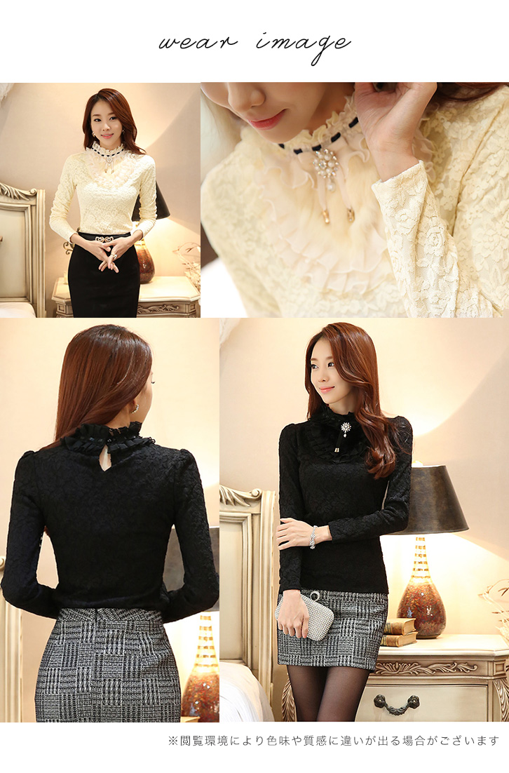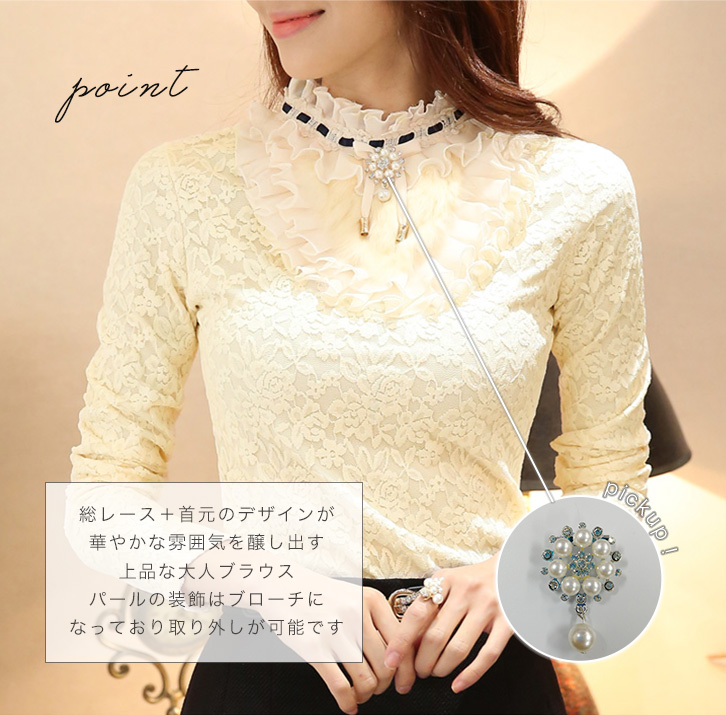 ブラウス 長袖 レディース 秋 春 冬 裏起毛 総レース レースブラウス ホワイト ブラック フリル ファー 大人かわいい キュート おしゃれ 綺麗め きれいめ ブローチ付き ブローチ取り外し可能 着心地抜群 肌触りあったか