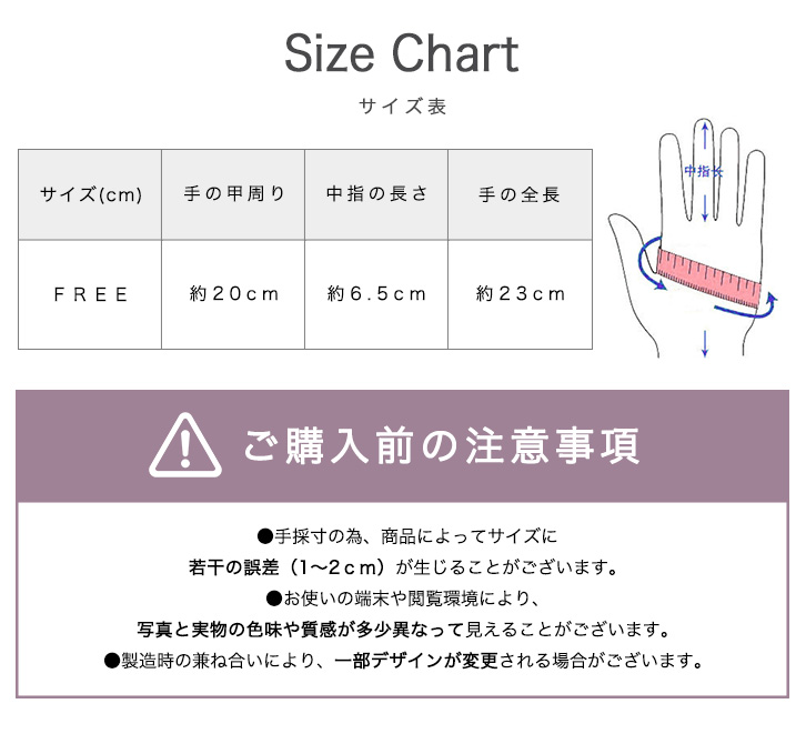 手の甲周り約20cm、中指の長さ約6.5cm、手の全長約23cm