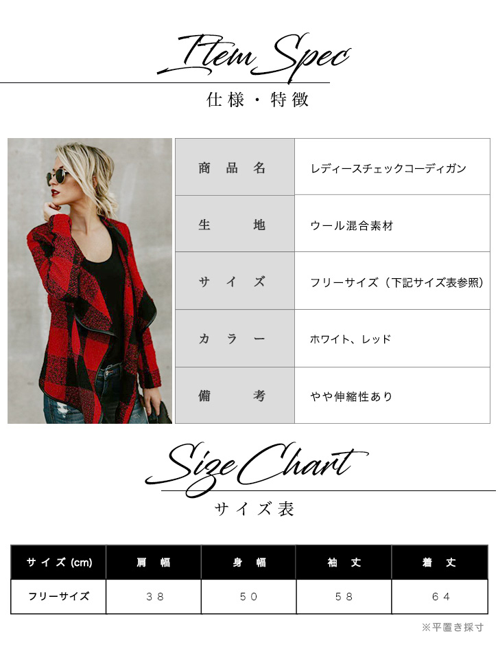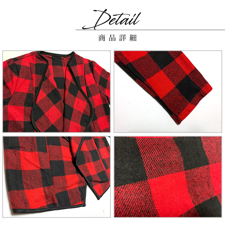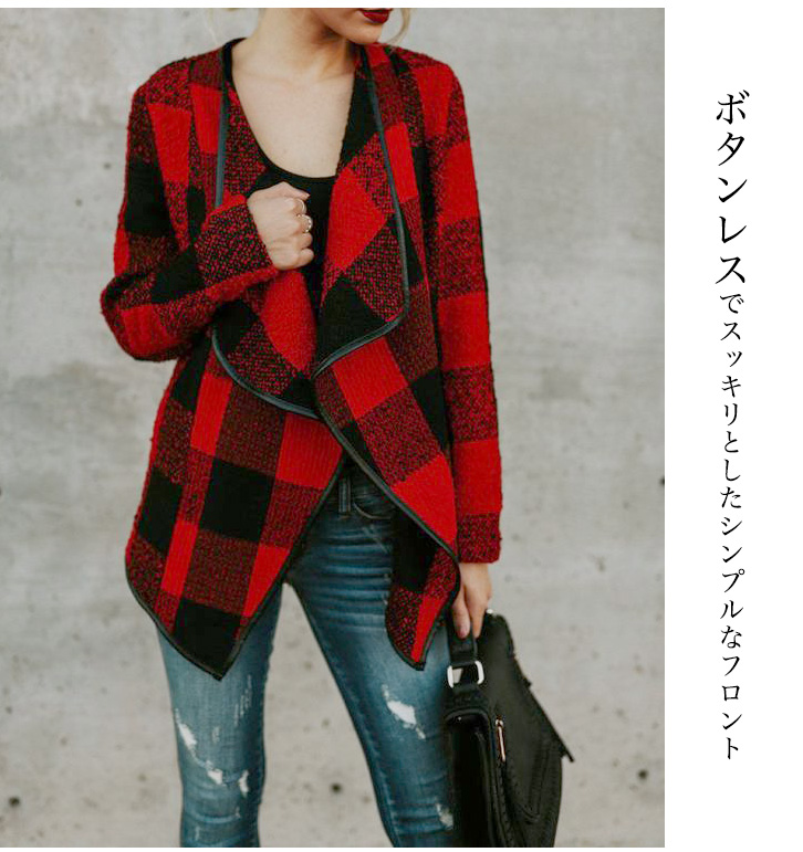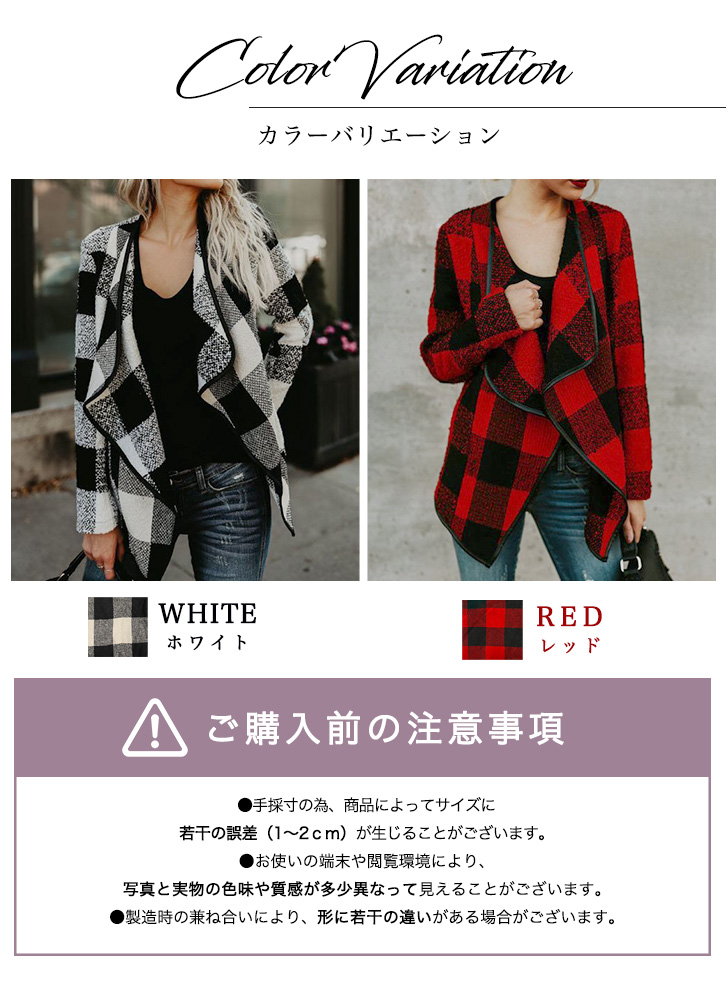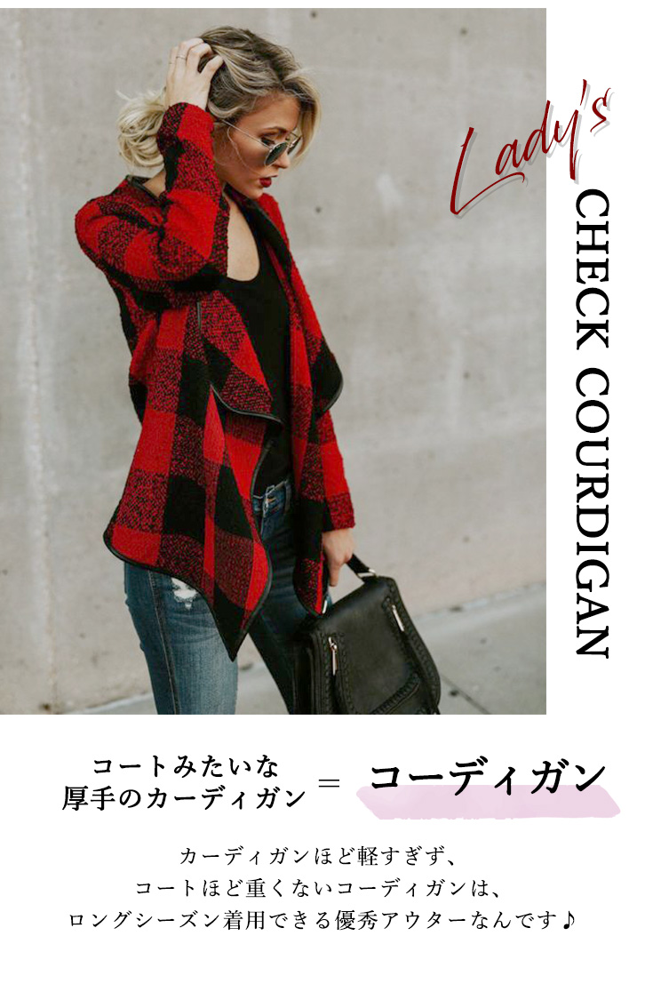 コーディガン レディース チェック柄 コート カーディガン チェックコーディガン おしゃれ アウター ロングシーズン 大ぶりチェック ボタンレス すっきりシルエット シンプル ホワイト レッド 春 秋 冬 羽織り フリーサイズ