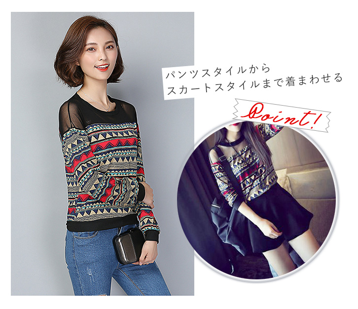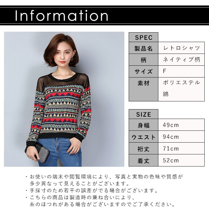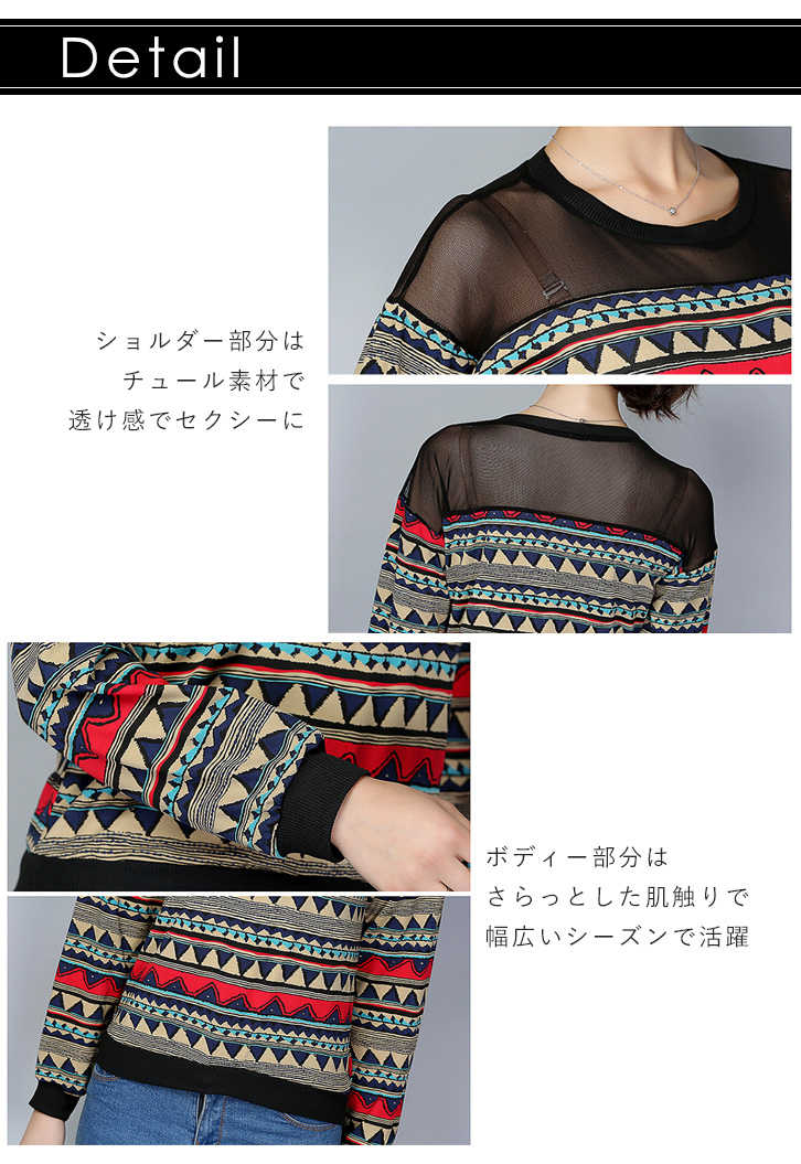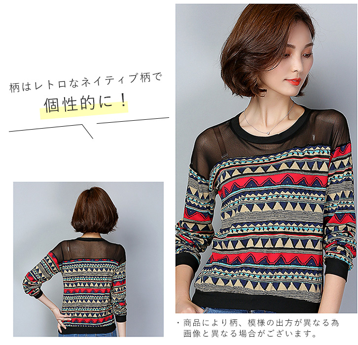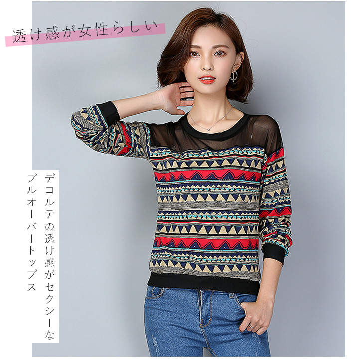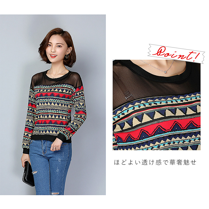 トップス レディース 長袖 プルオーバー 透け感 ネイティブ デコルテ魅せ フリーサイズ セクシー プルオーバートップス 着回し力 さらっとした肌触り 着心地抜群 オールシーズン レトロ レディーストップス 個性的