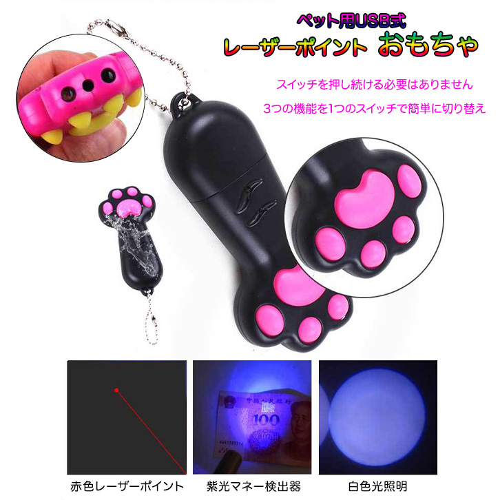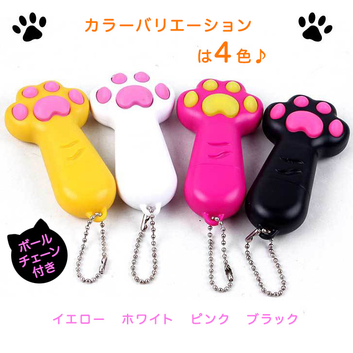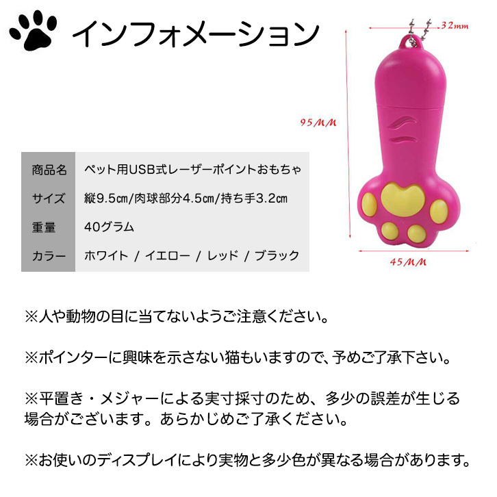 猫おもちゃ 猫用おもちゃ 玩具 ペット用 レーザーポインター レーザーポイント USB式 ビーム レーザー光 光る 夢中 肉球 肉球デザイン 運動不足解消 イエロー ホワイト ピンク ブラック ボールチェーン付き 持ち運び便利