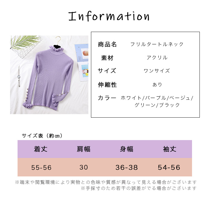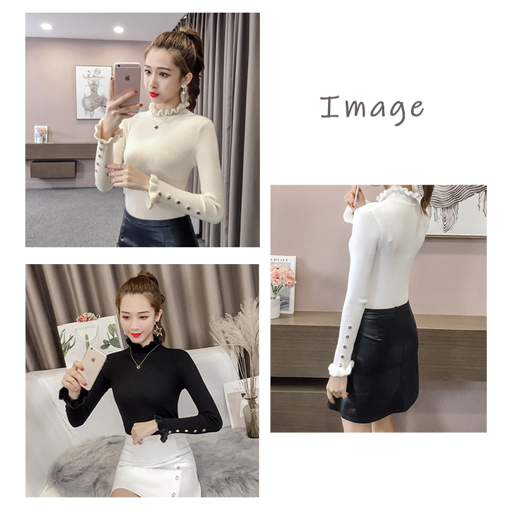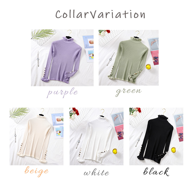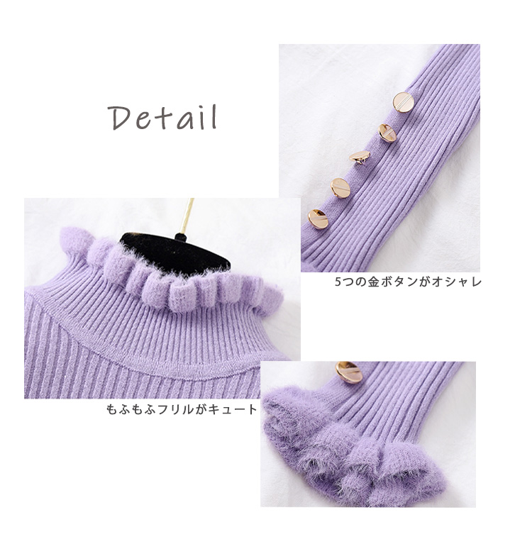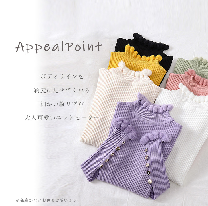 フリルタートルネック ニットセータータートルネック 縦リブニット 大人可愛い もふもふ フリル 冬ニット 無地 シンプル あったか 秋 冬 スリム カジュアル 着回し 金ボタン 柔らかニット カラー豊富 袖ボタン トップス