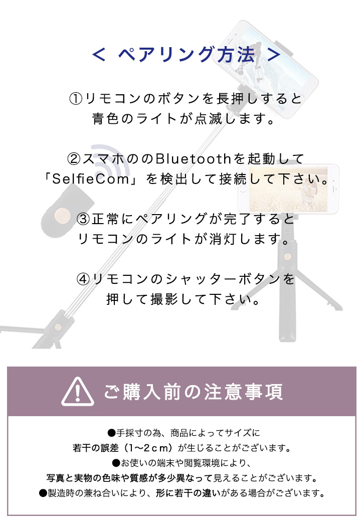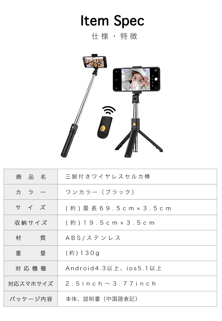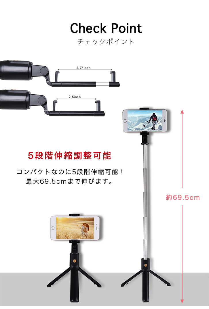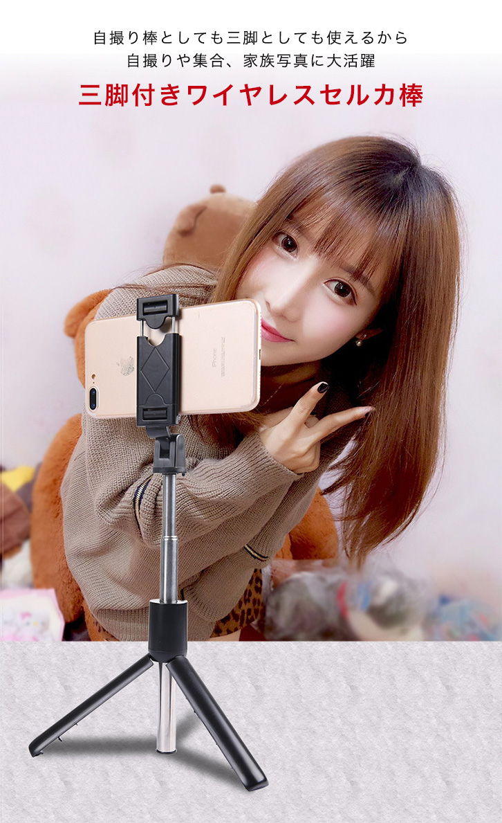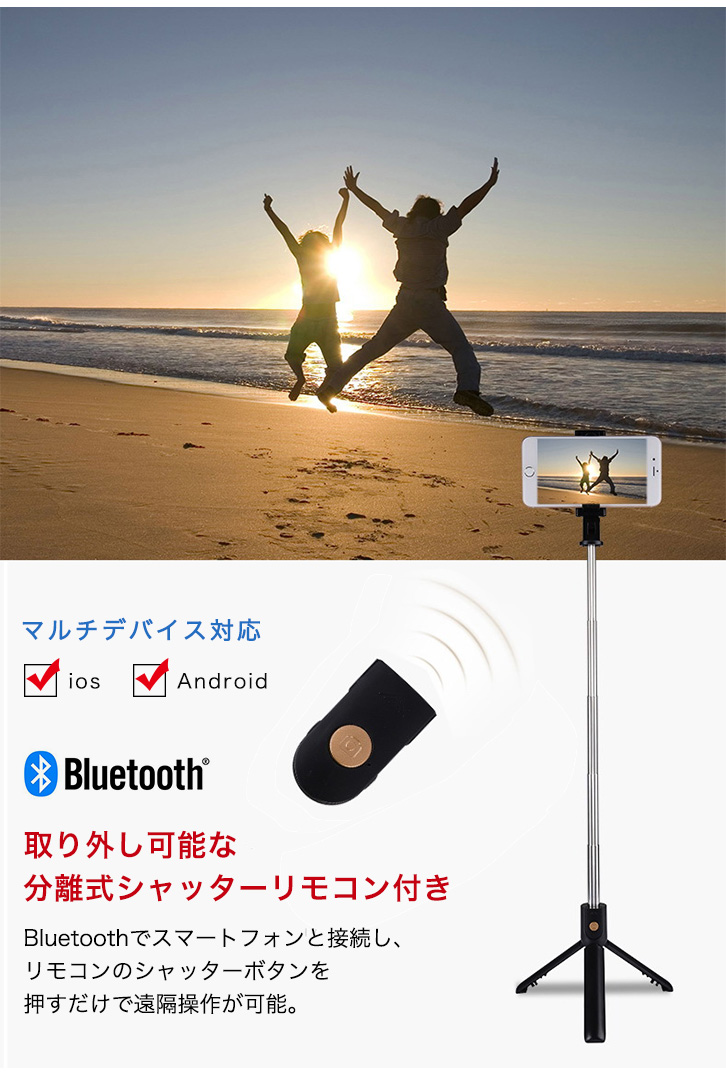 手持ちはもちろん、 離れた場所からでも三脚を立てて撮影ができるマルチなセルカ棒です