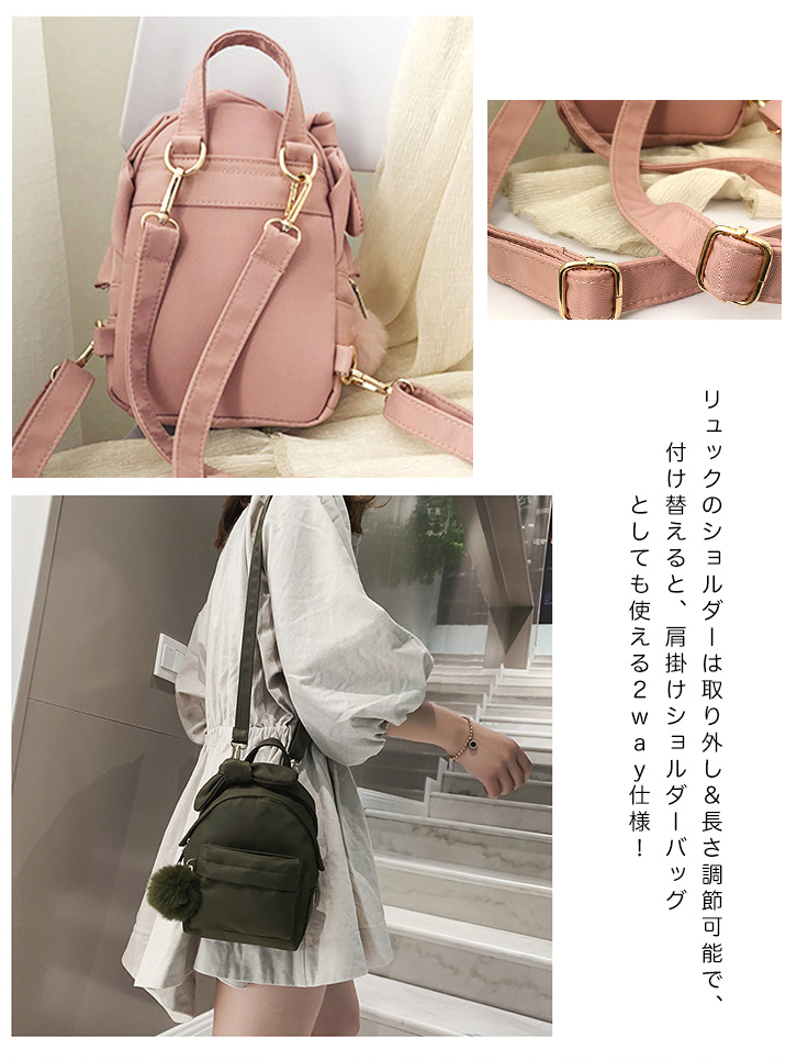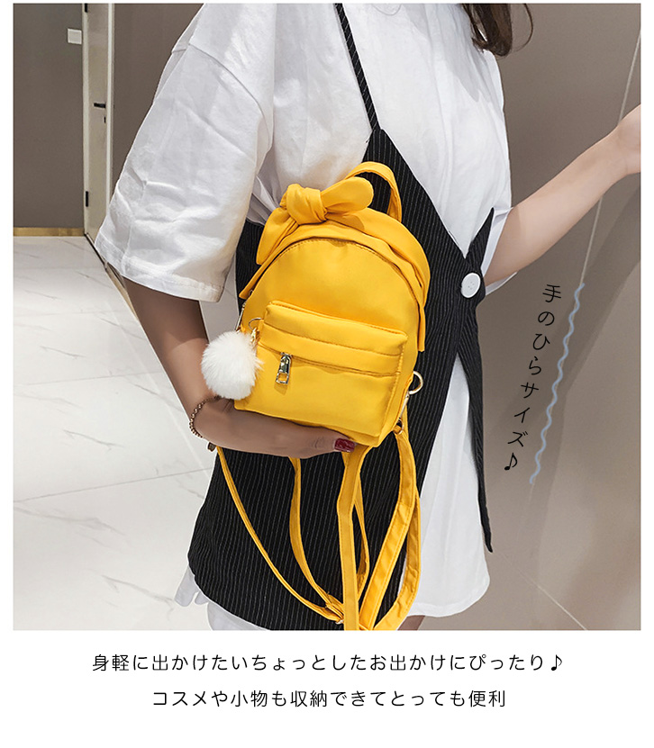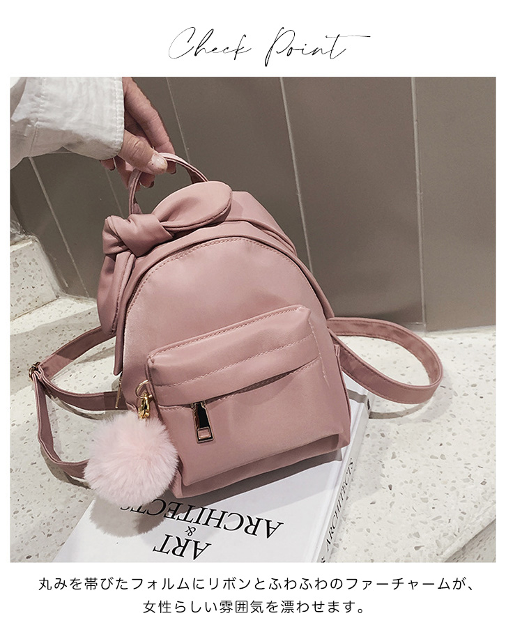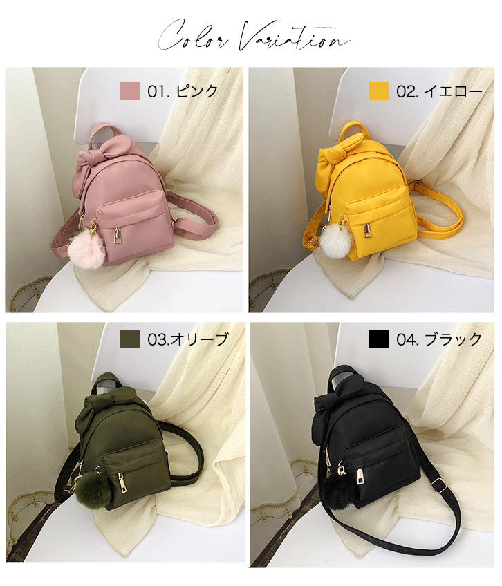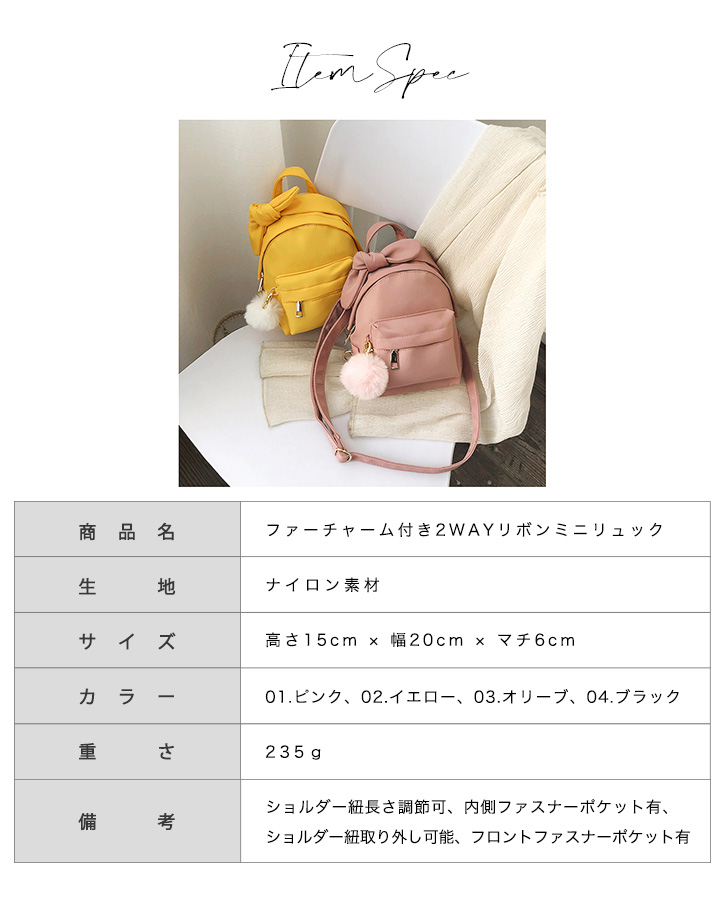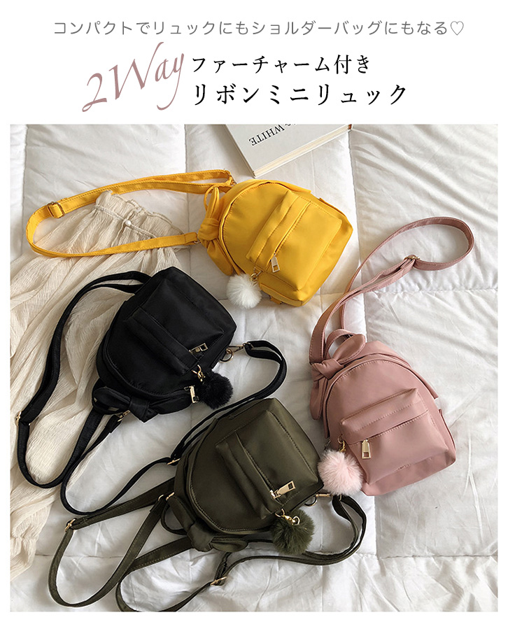 ミニリュック バックパック レディース リュック ミニサイズ 小さめ リボン リボンリュック 2way ファーチャーム付き ファー ショルダーバッグ おしゃれ かわいい 大人かわいい コンパクト デイリー ピンク イエロー オリーブ ブラック