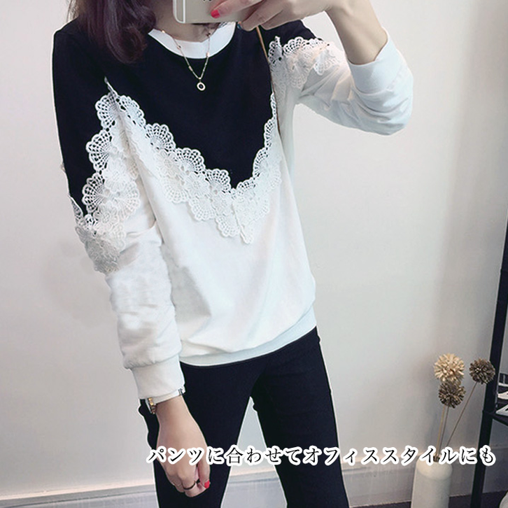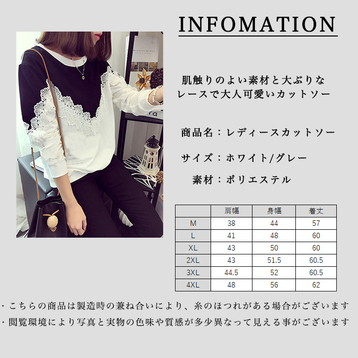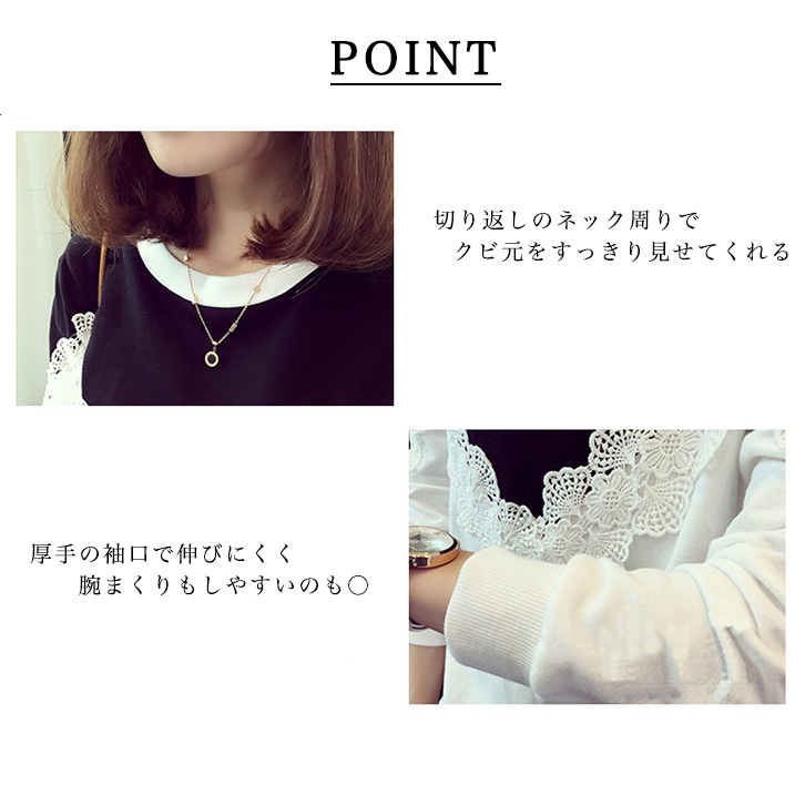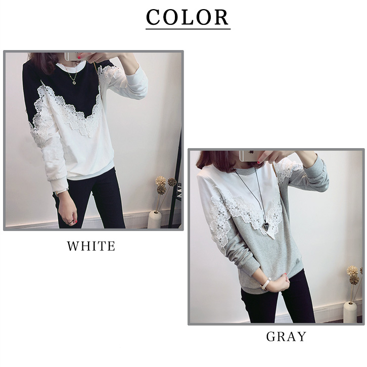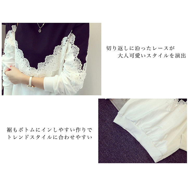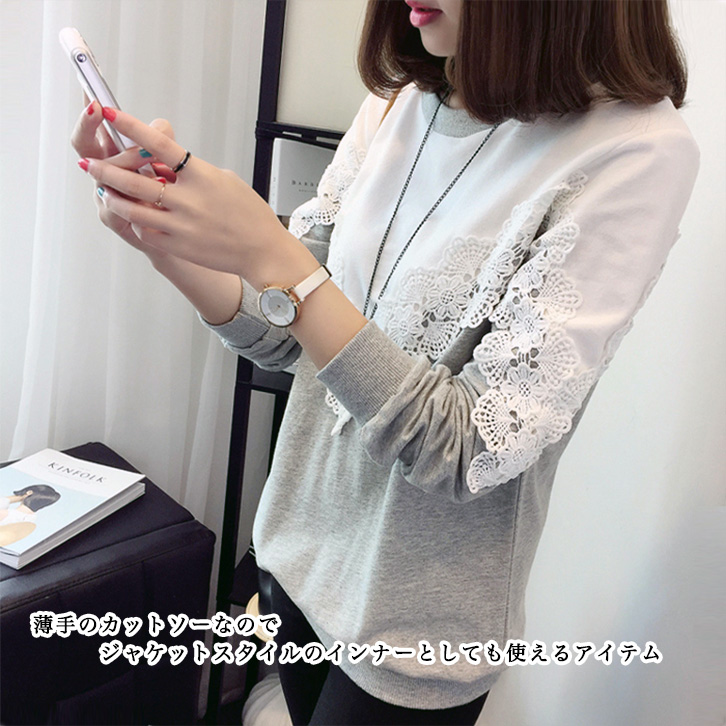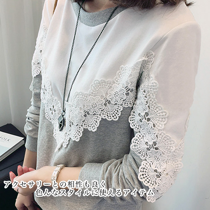 トップス 長袖 レディース カットソー レース 切り返し かわいい おしゃれ 大人かわいい 大人カジュアル 薄手 レディーストップス 着回し抜群 合わせやすい シンプル ツートンカラー バイカラー オシャレ グレー ホワイト