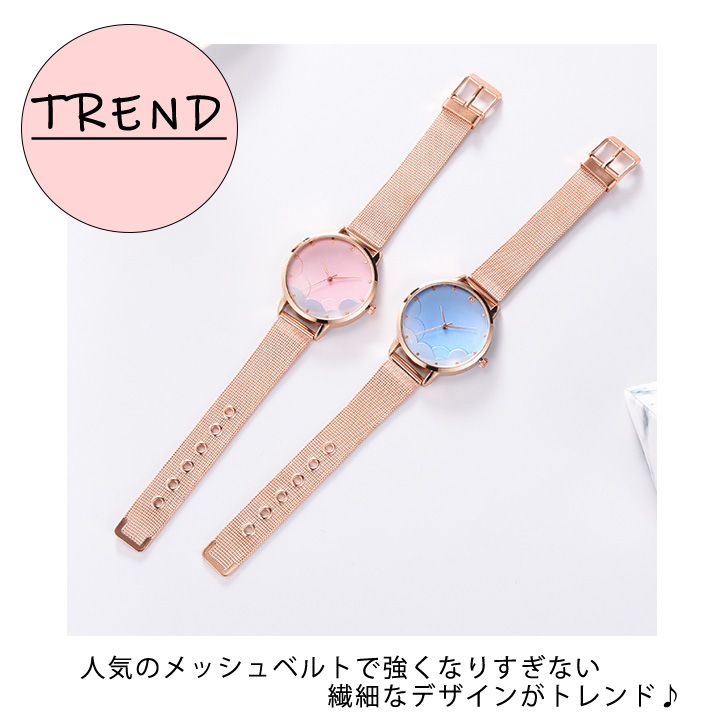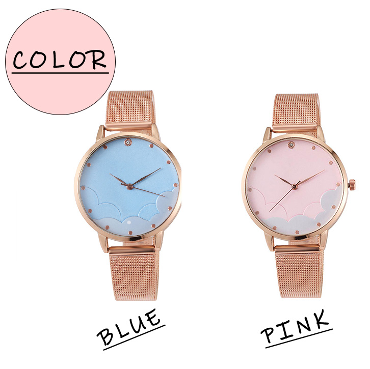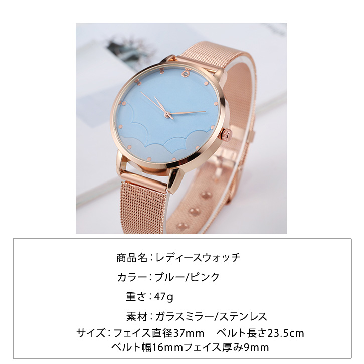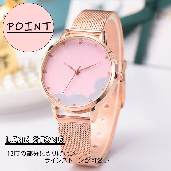 腕時計 レディース レディース腕時計 レディースウォッチ ウォッチ 女性 ブルー ピンク ストーン ラインストーン シンプル 雲 おしゃれ 可愛い メッシュベルト ピンクゴールド デイリー カジュアル オフィスカジュアル かわいい